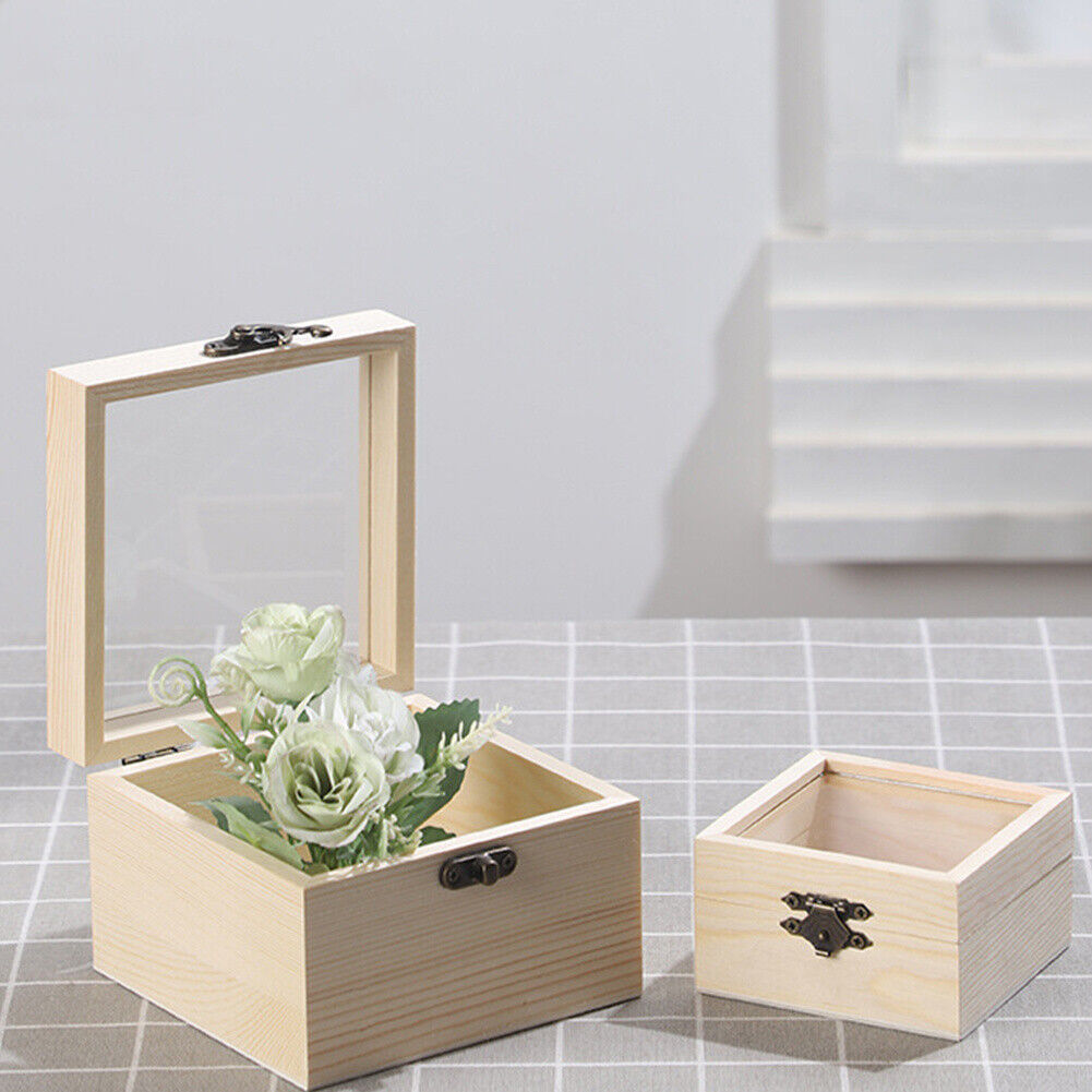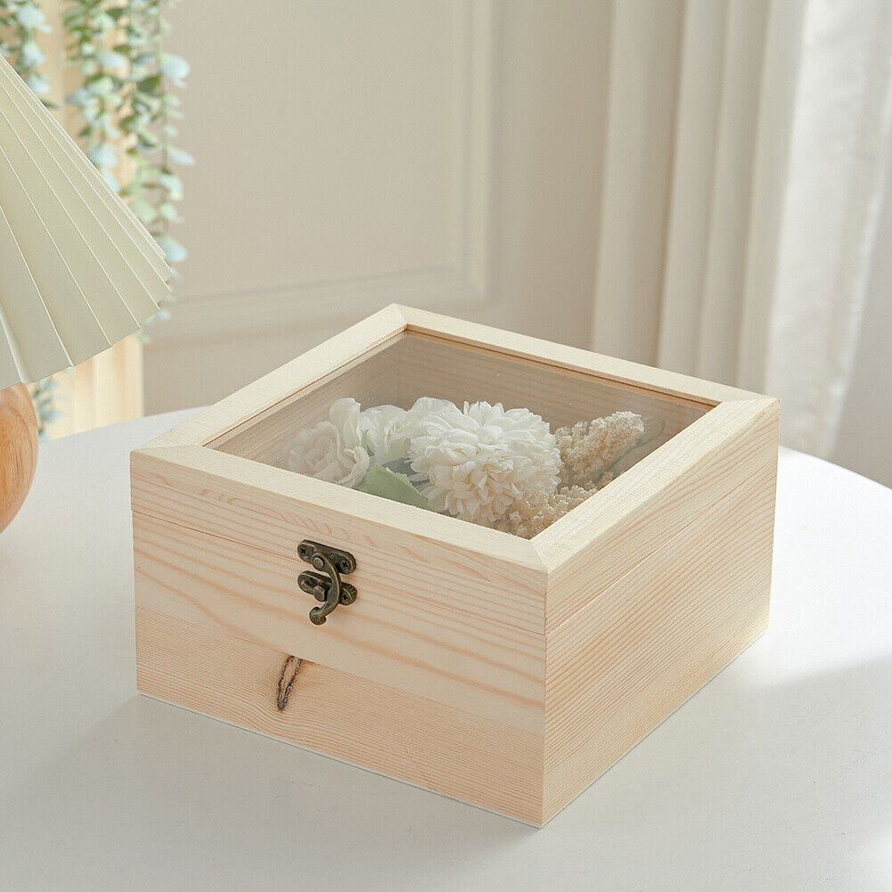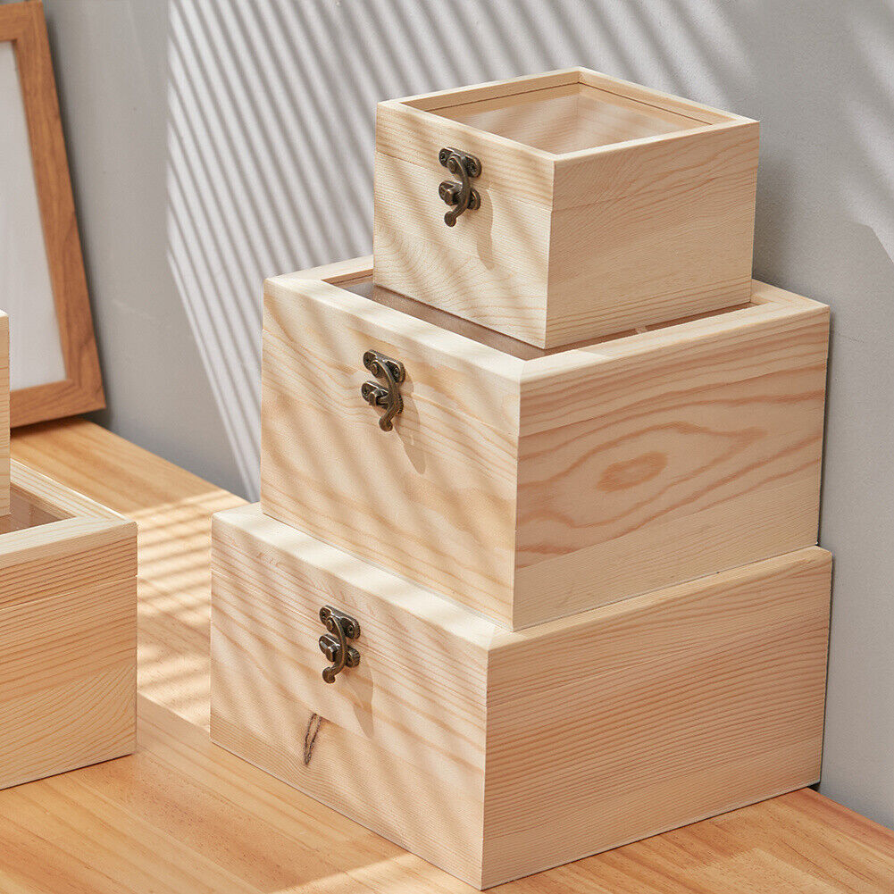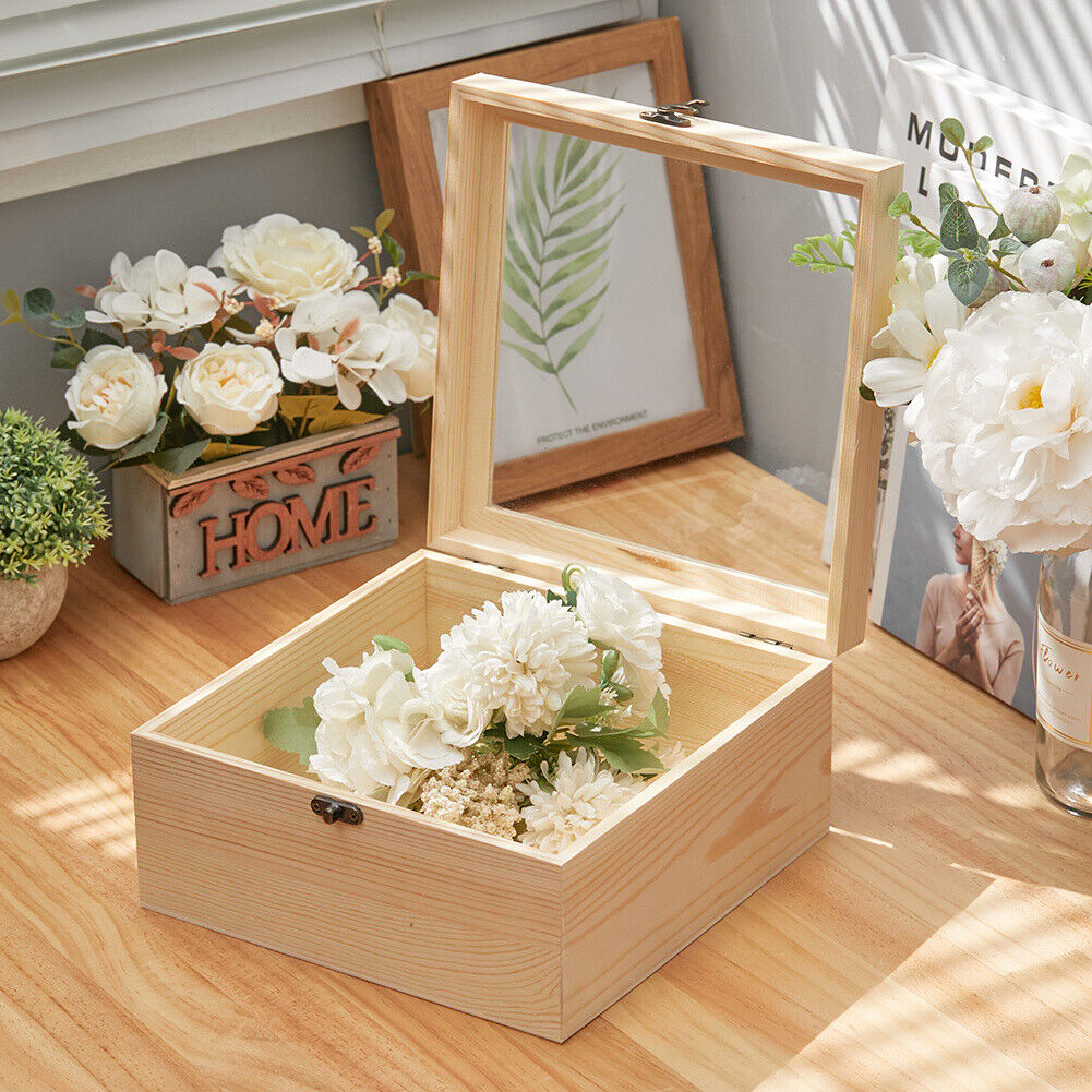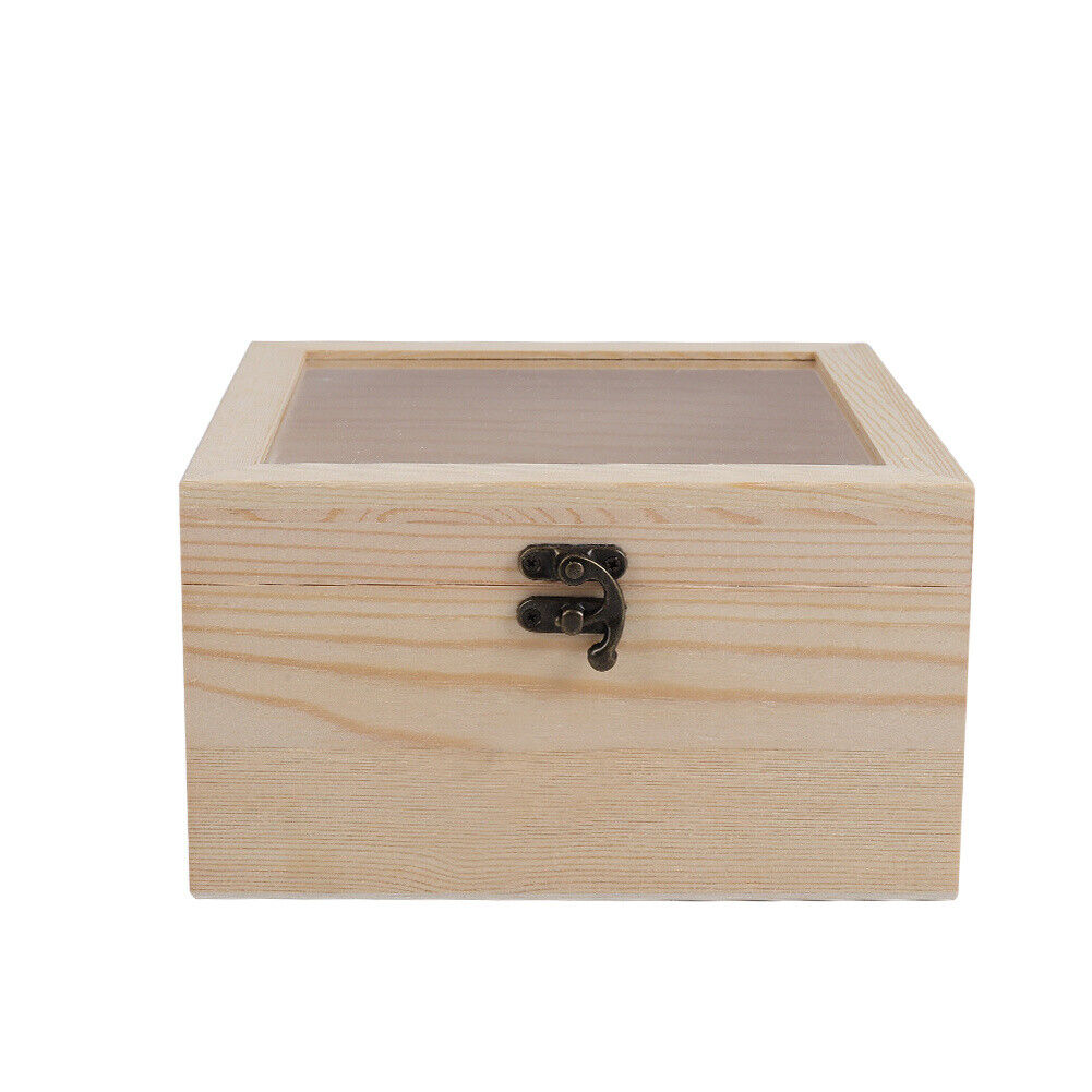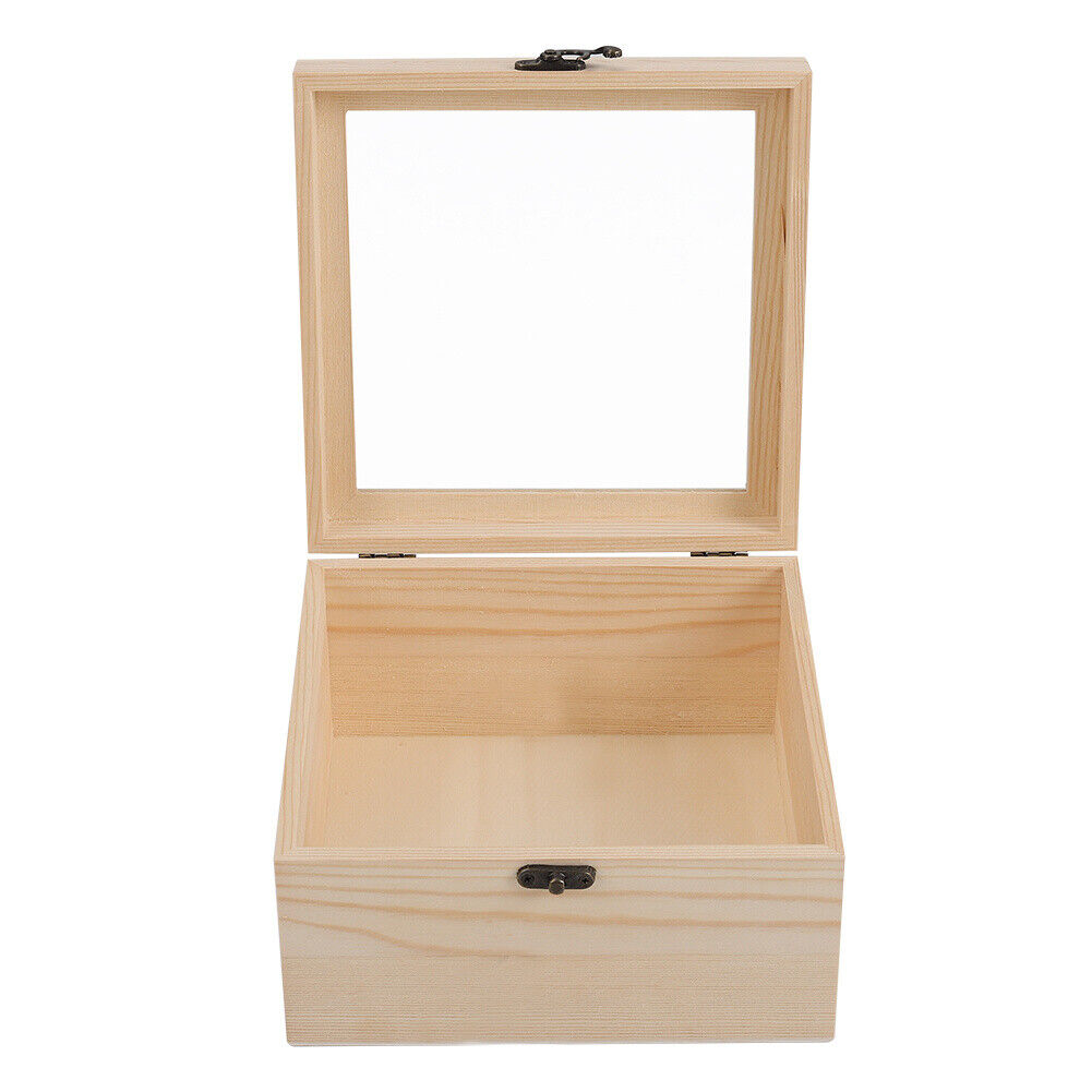 Natural Finish Wooden Chest Storage Box Memory Keepsake Box DIY Hinged Glass Lid