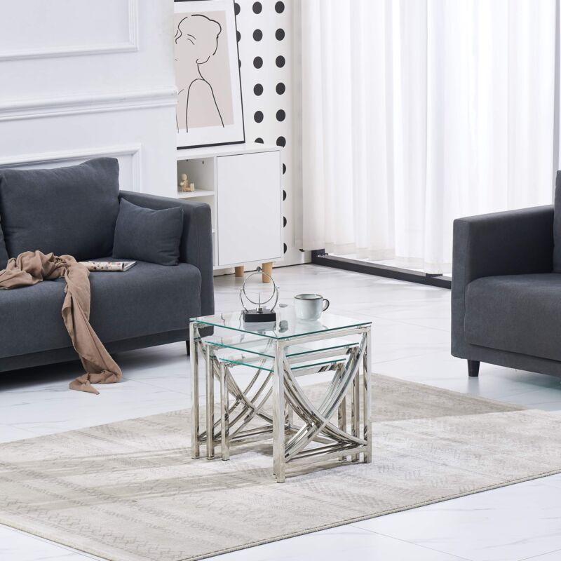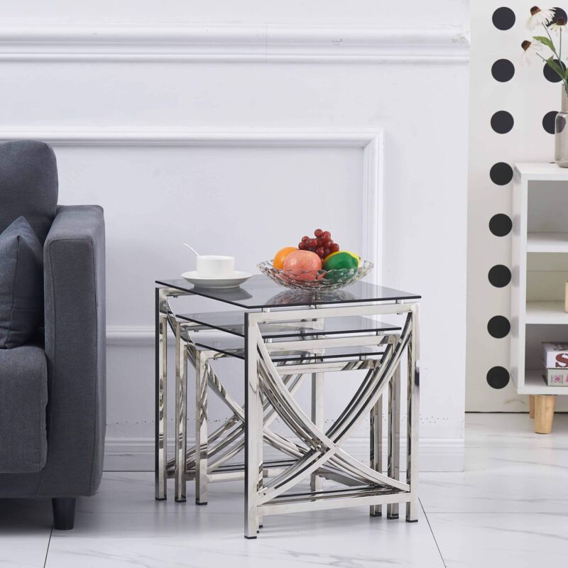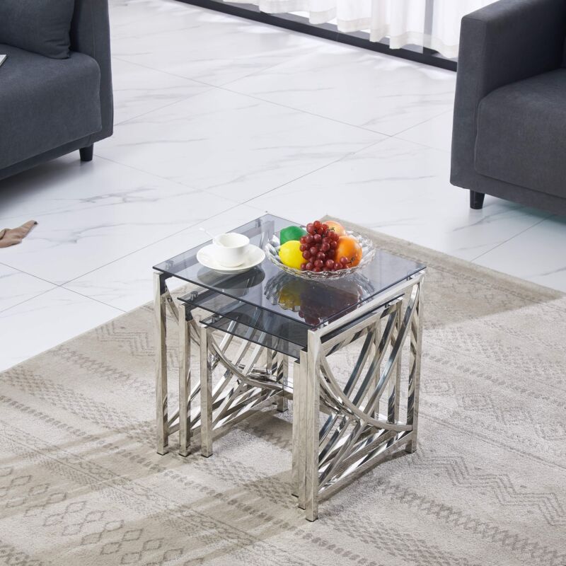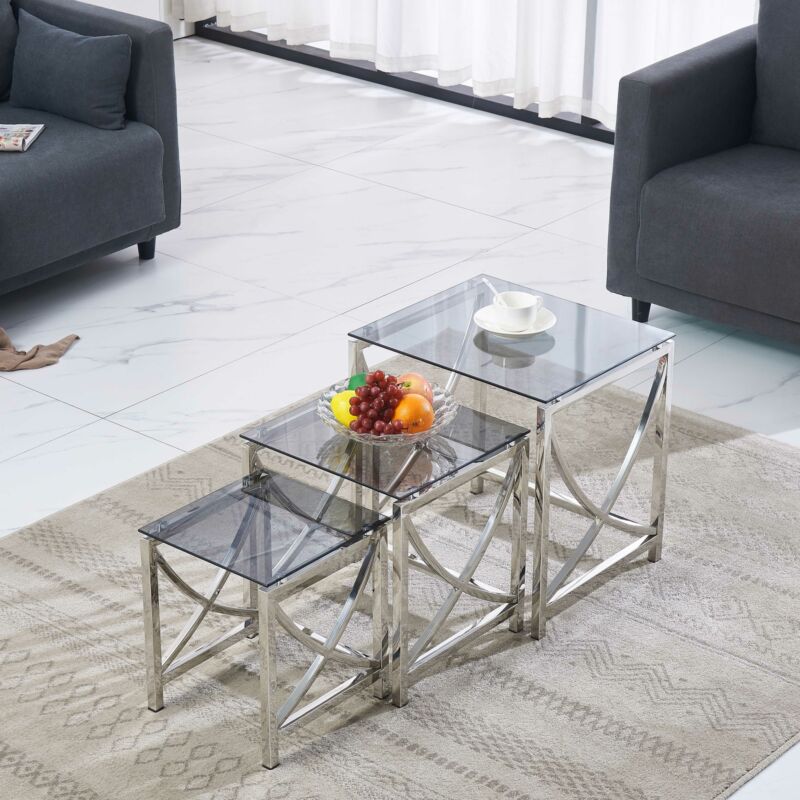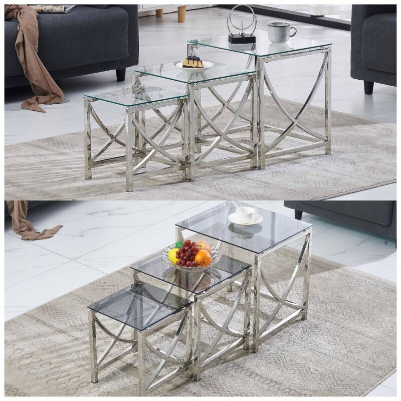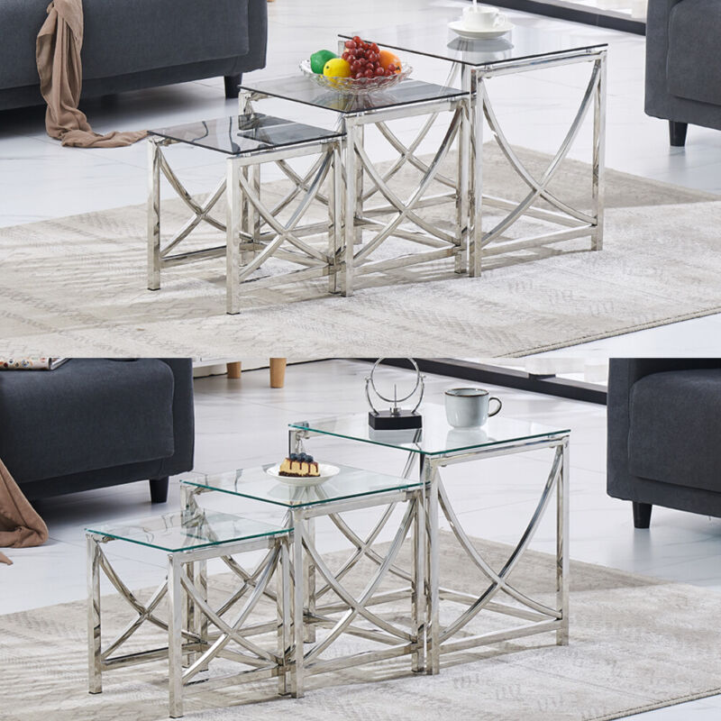 Nest of 3 Coffee Table Sofa Side End Table Tempered glass Stainless Steel Legs