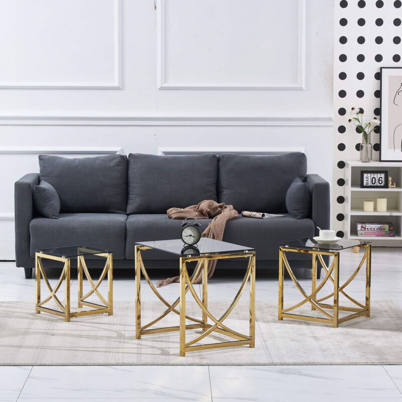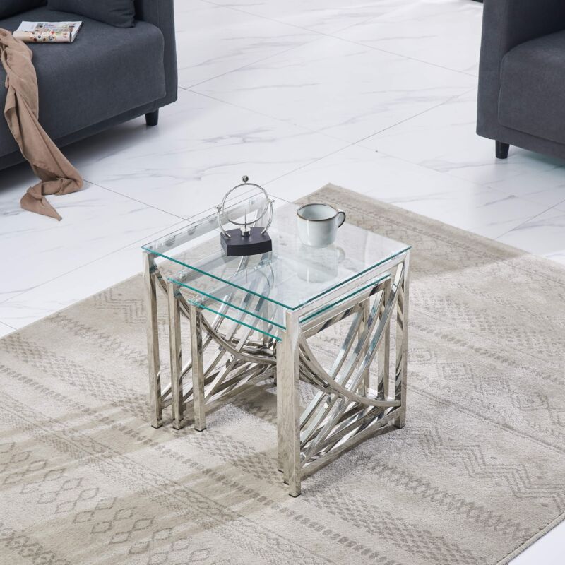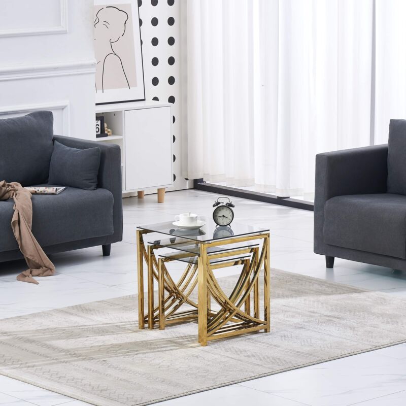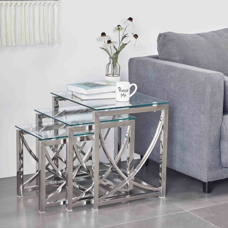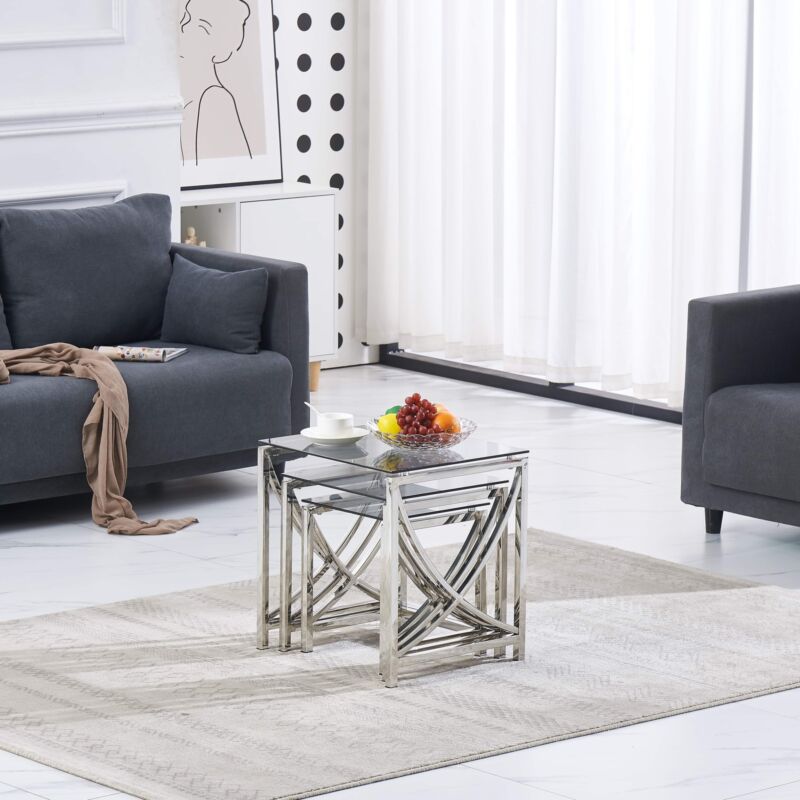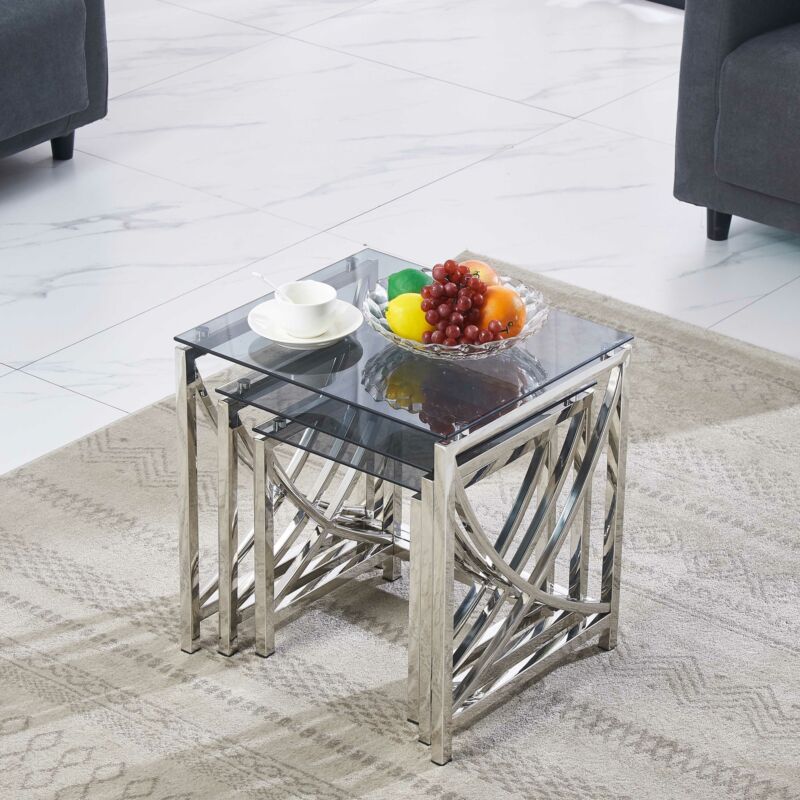 Nest of 3 Coffee Table Sofa Side End Table Tempered glass Stainless Steel Legs