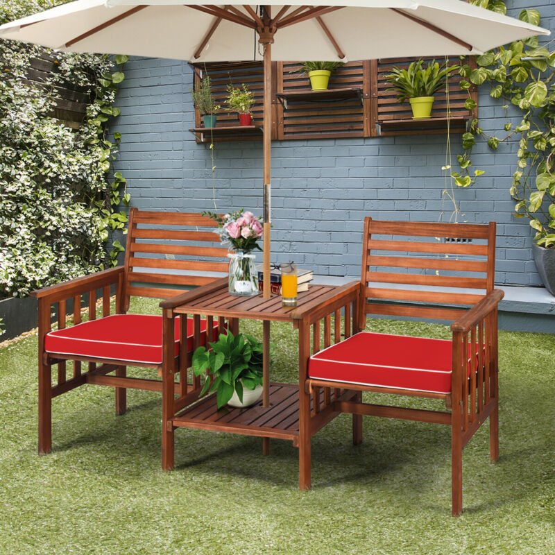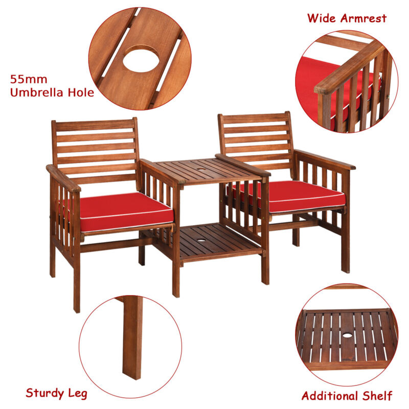Outdoor 2-Seater Wooden Cushioned Chair 2 Tier Middle Tea Table W/Umbrella Hole