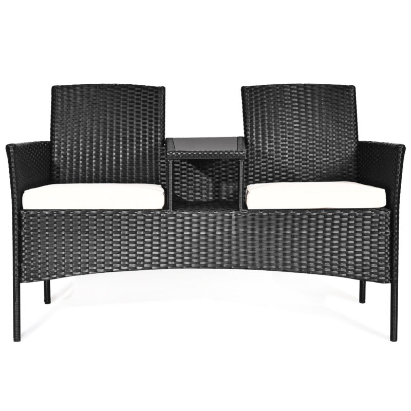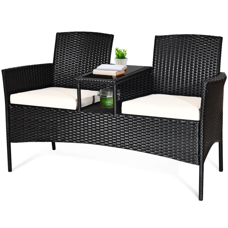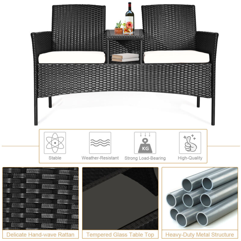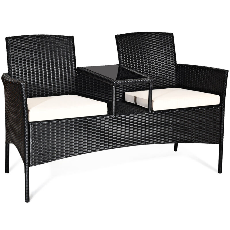 Outdoor Garden Furniture 2-Seater Rattan Chair Middle Tea Table Padded Cushions