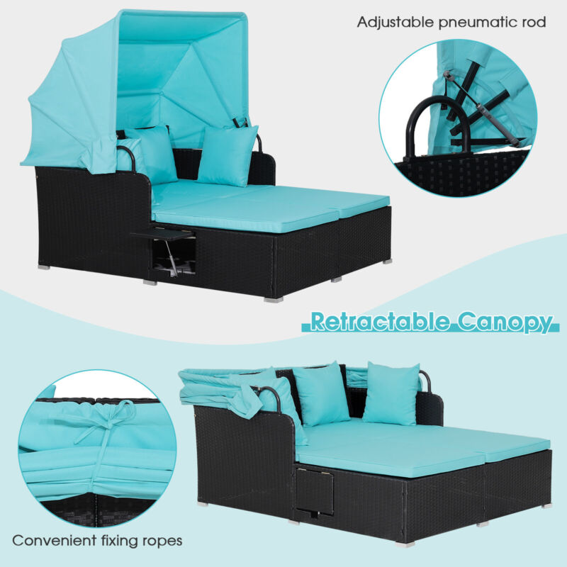 Outdoor Hand-Woven PE Wicker Daybed Sun Lounger Patio Loveseat Sofa Set w/Canopy