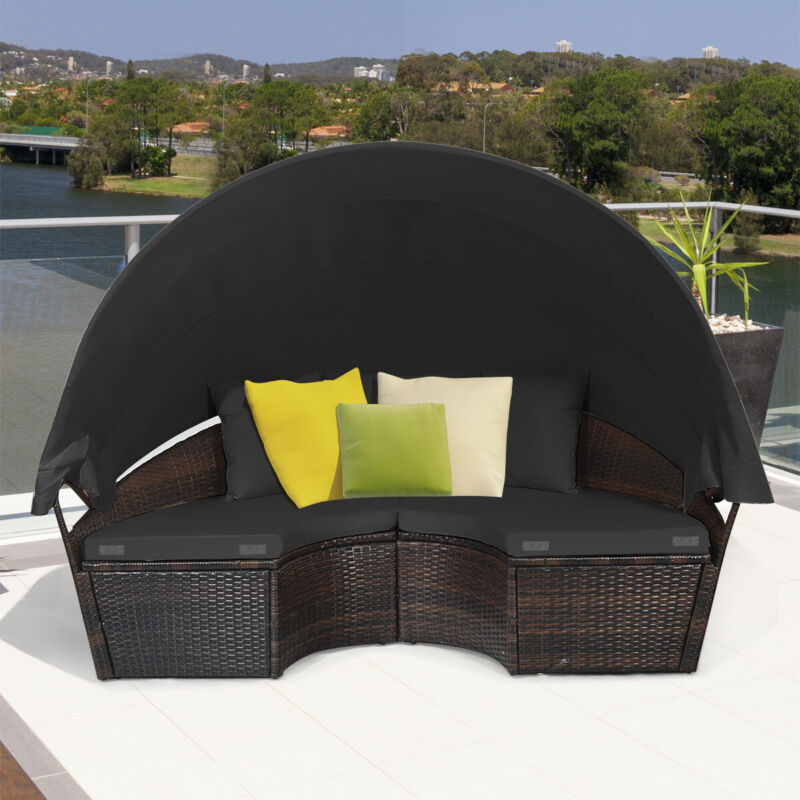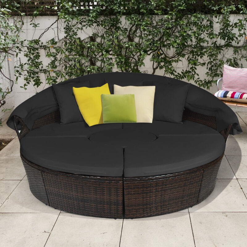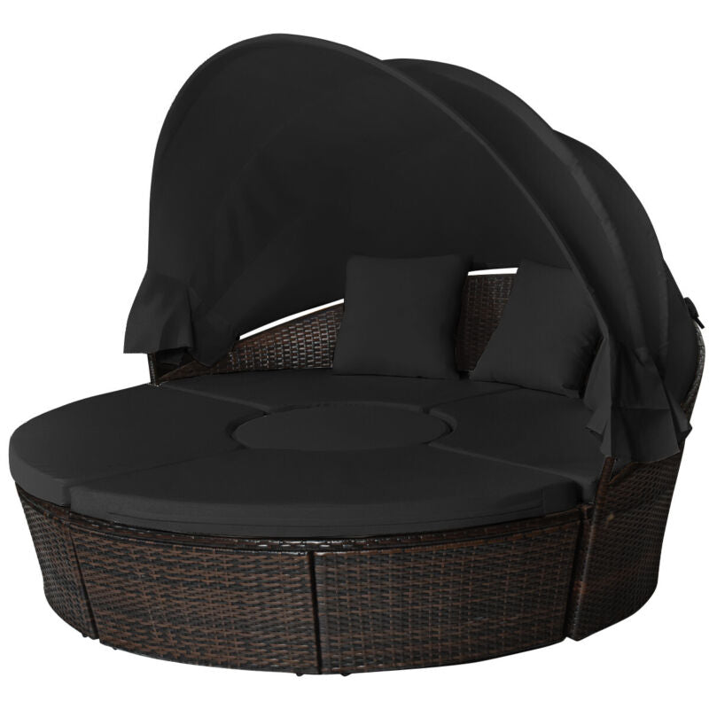 Outdoor Rattan Daybed Patio Garden Sectional Furniture Set W/ Retractable Canopy