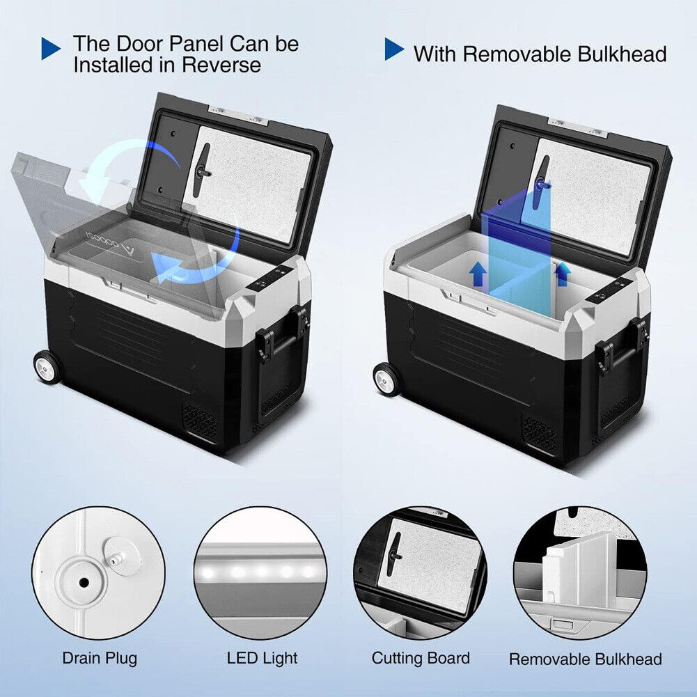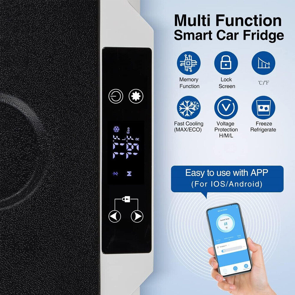 Features Car Connection, Digital Display, LED Display, Portable, With Wheels, Shockproof, Two Temperature Control Systems, With Basket, Leak-proof Liner, APP Electronic Control, Dual Zone, Warmer +20℃, Cooler -20℃