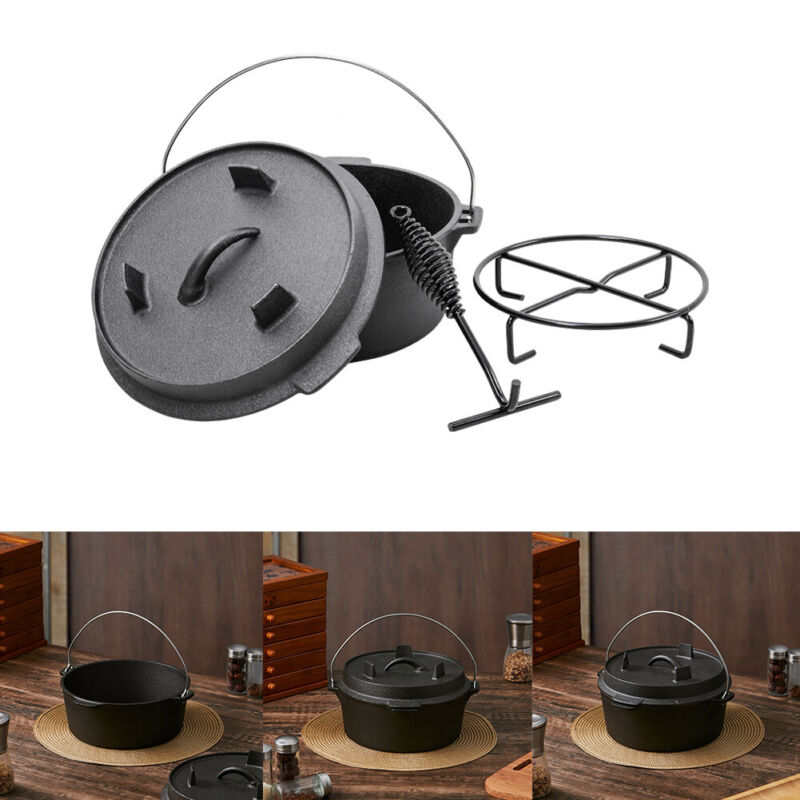 Pre-seasoned Cast Iron Dutch Oven Stockpot Camping Stew Pots w/ Lid Lifter Stand