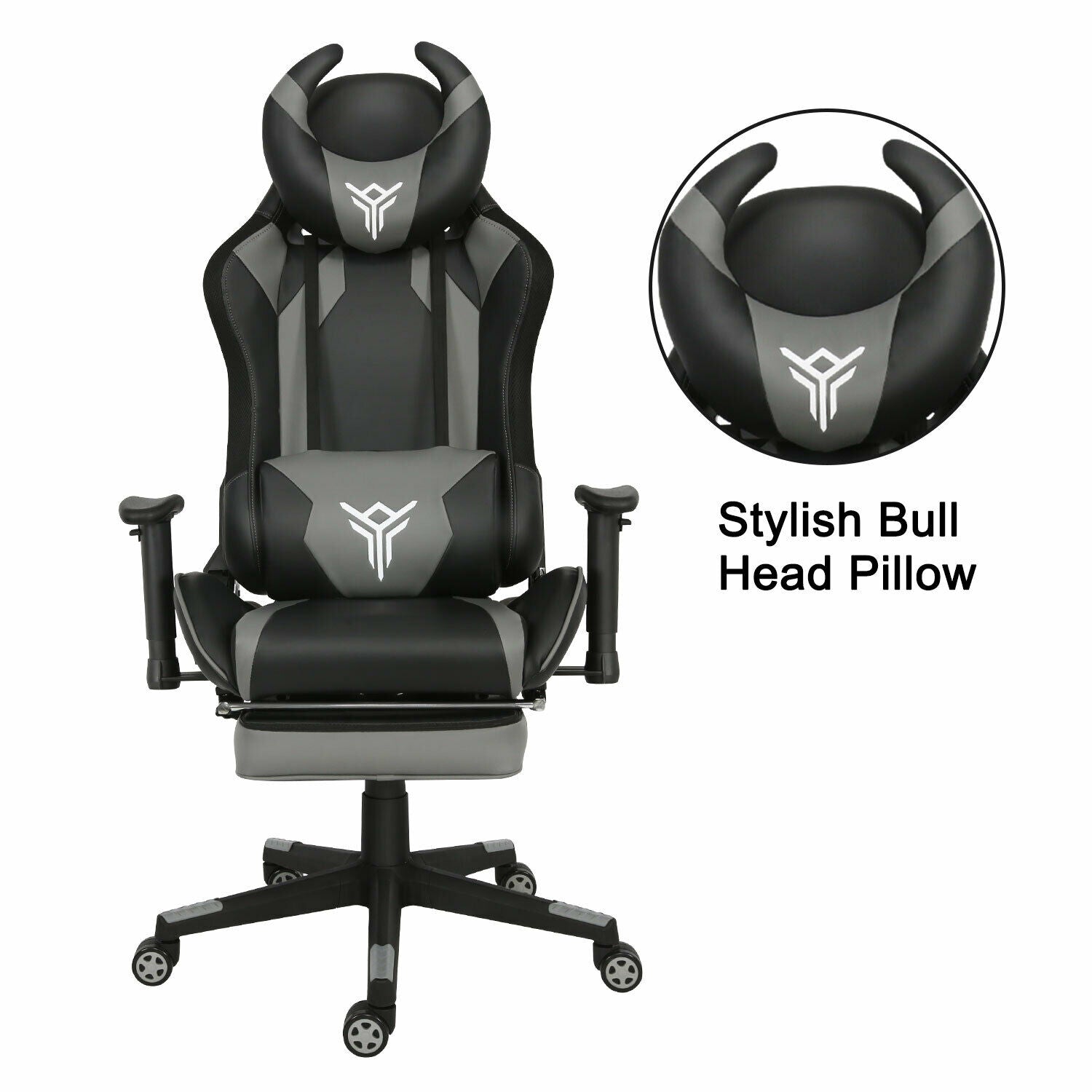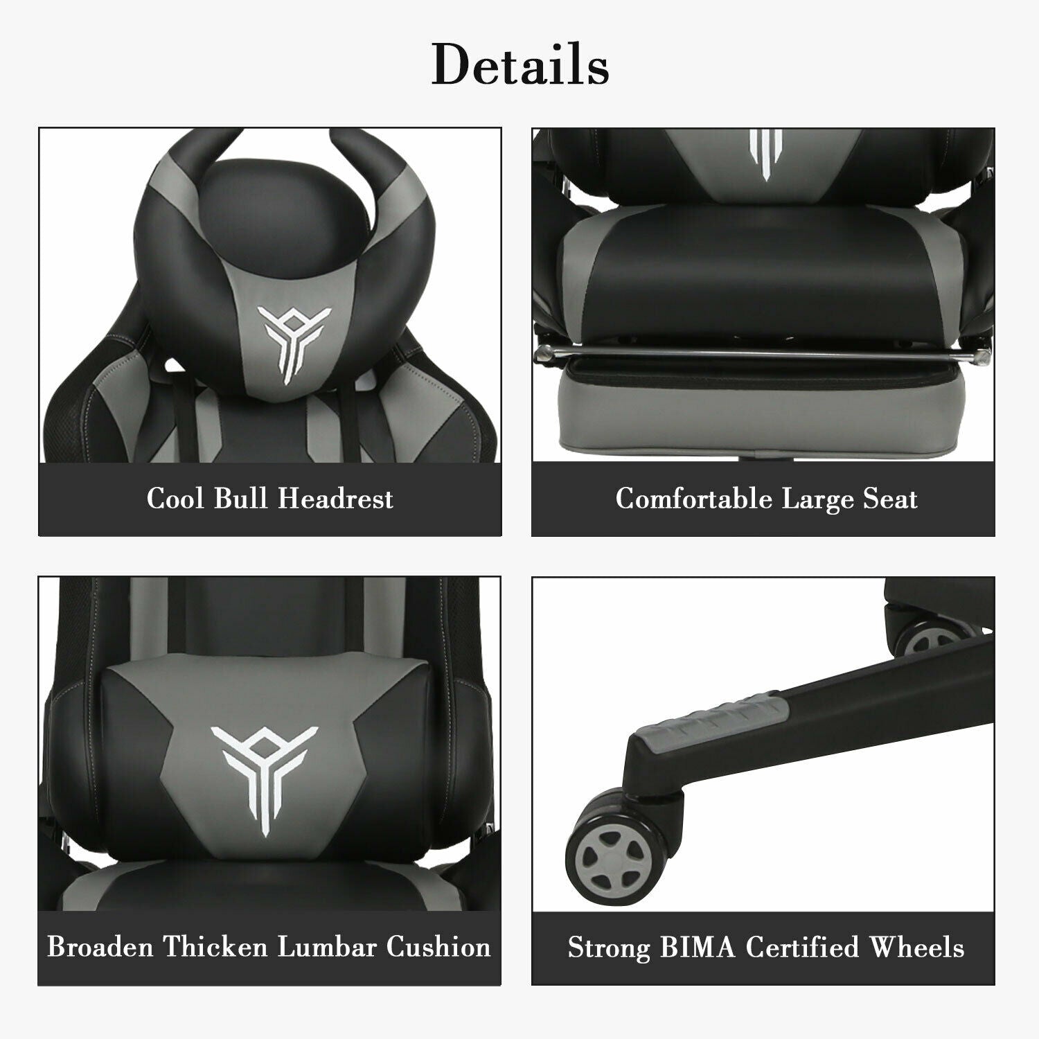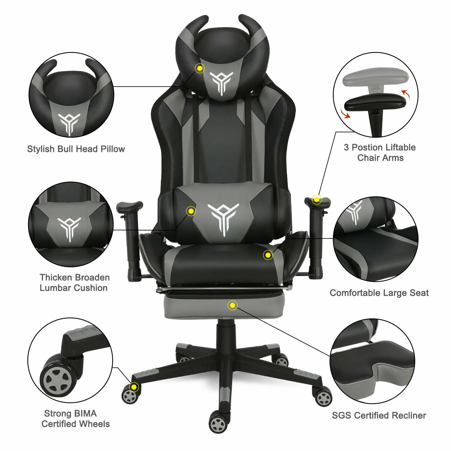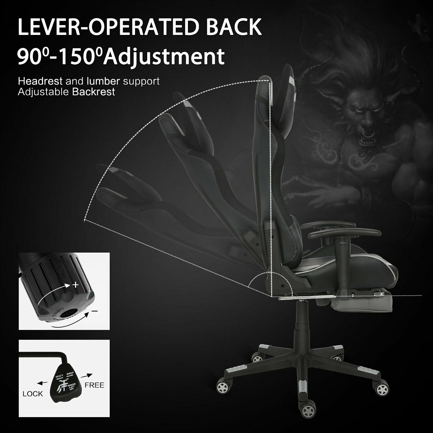 Racing Gaming Chair Swivel PU Computer Desk Office Chair Ergonomic Recliner Grey