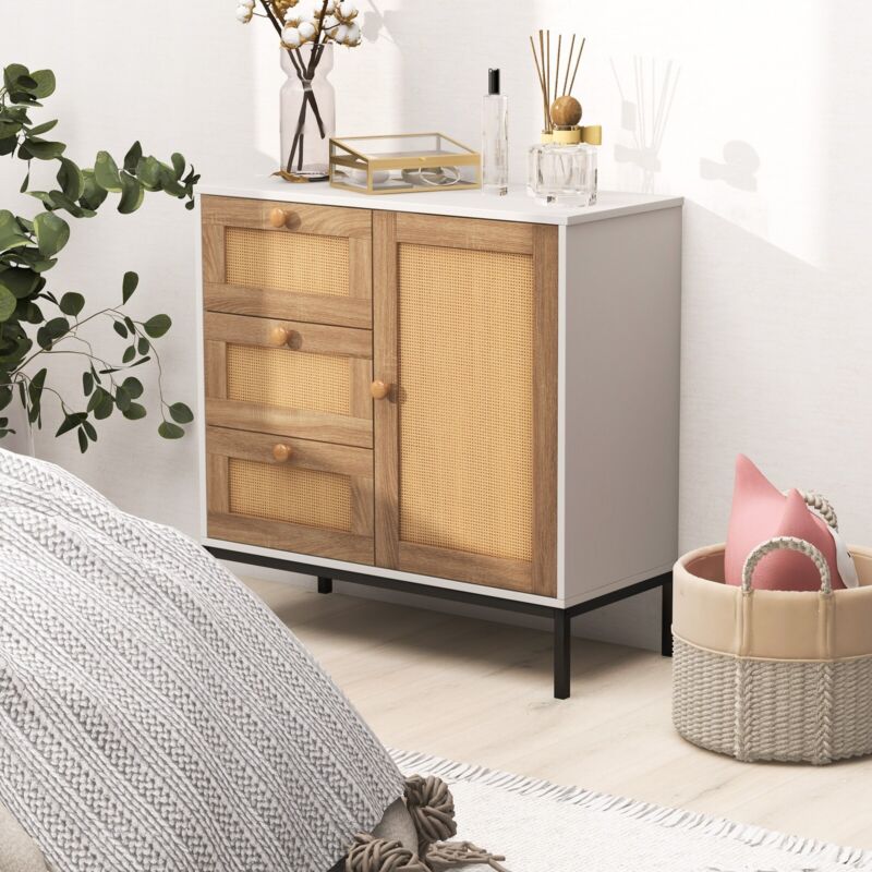 Rattan Buffet Cabinet Storage Sideboard Bar Accent Cabinet 1 Door and 3 Drawers