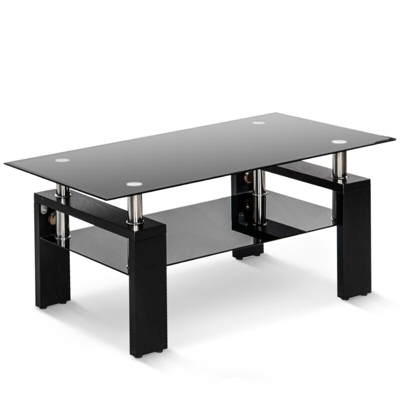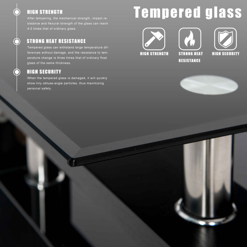 Rectangle Glass Black Coffee Table Modern Living Room Furniture with Shelf