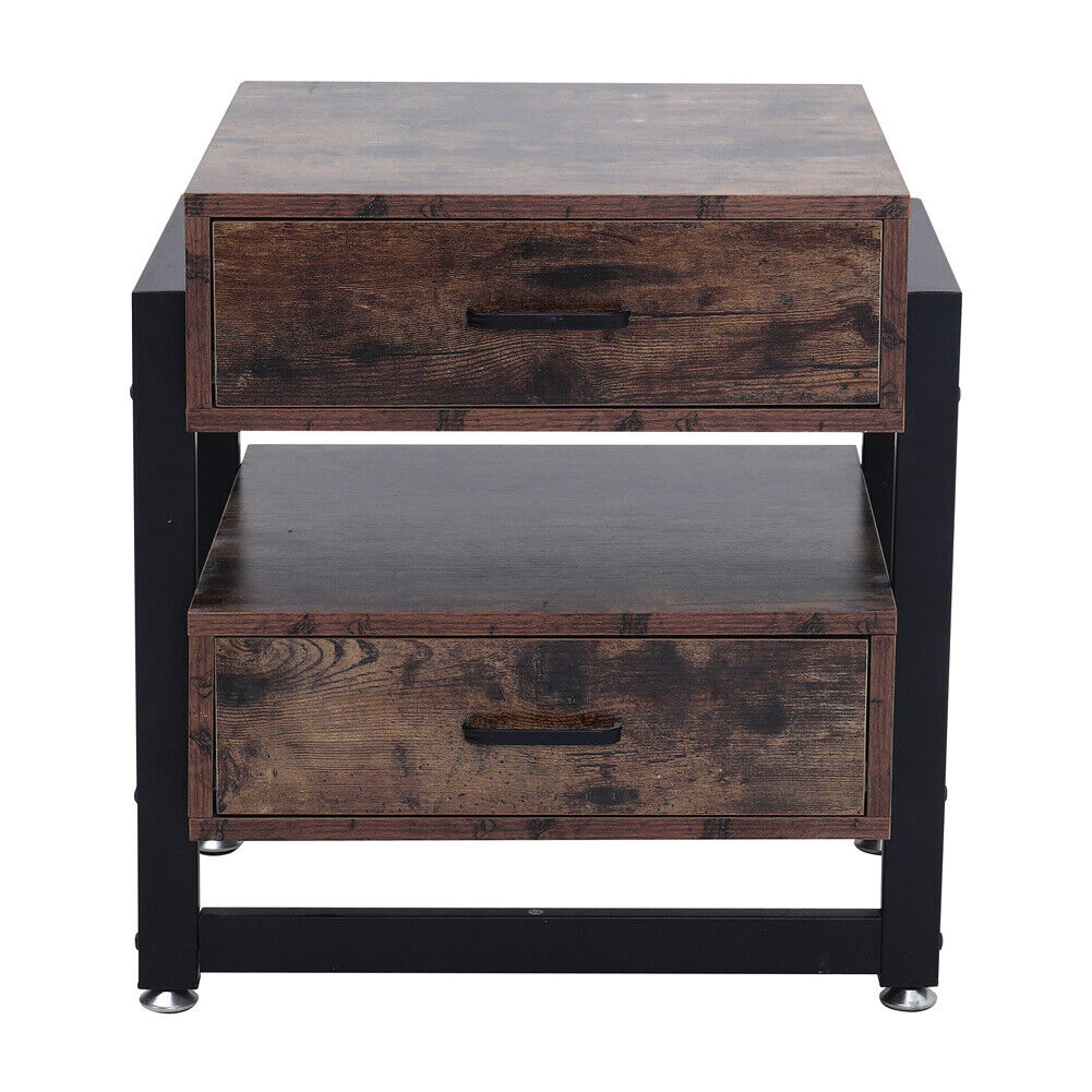 Retro 2 Drawer Chic Nightstand Bedside Cabinet Wooden Storage Table Metal Frame