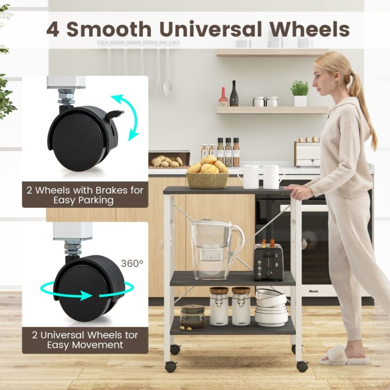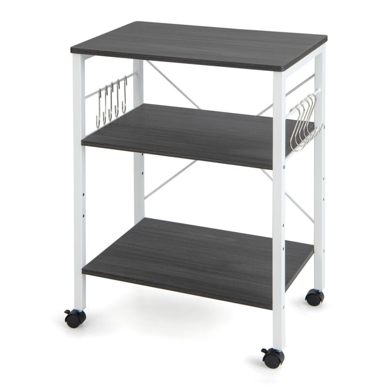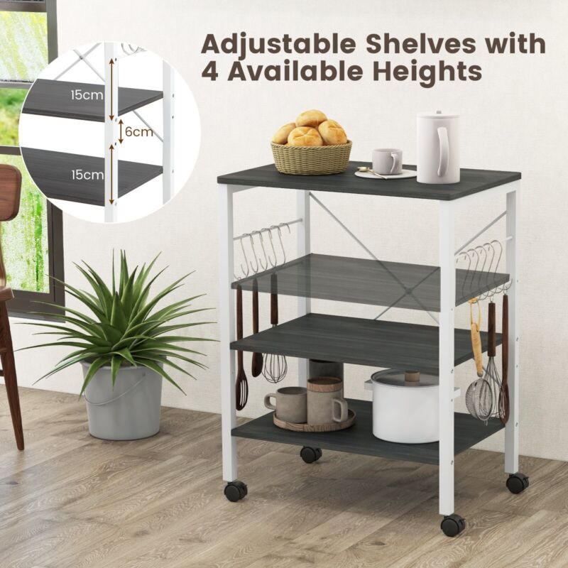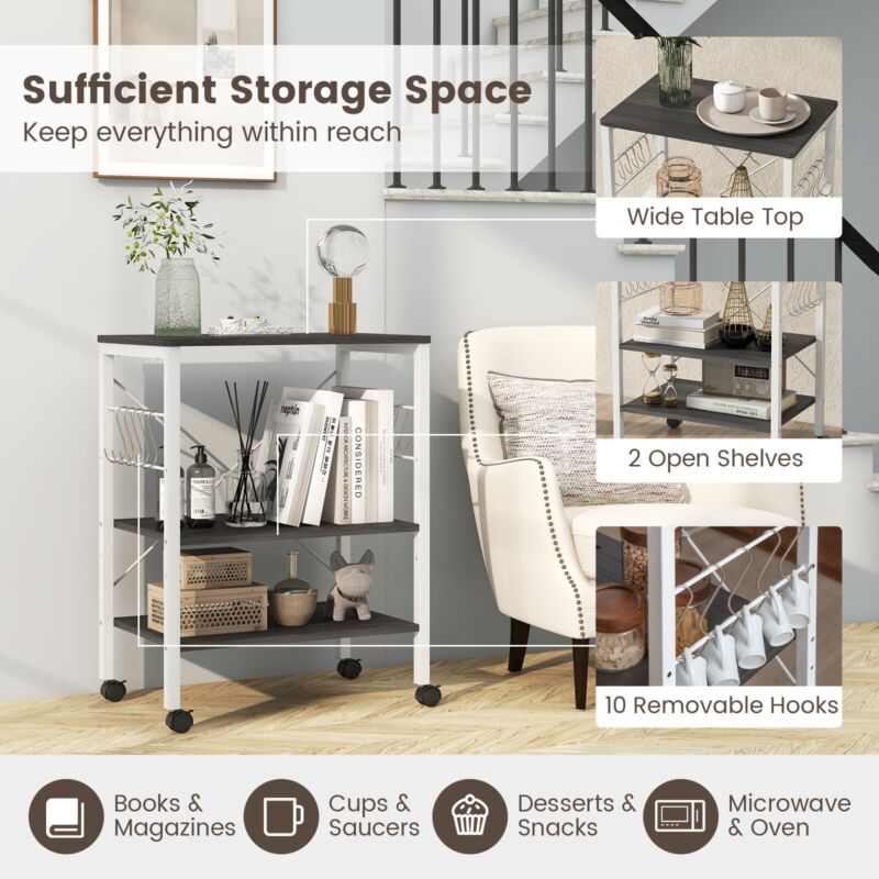 Rolling 3 Tier Serving Cart Kitchen Storage Trolley Utility Cart W/ 10 Hooks