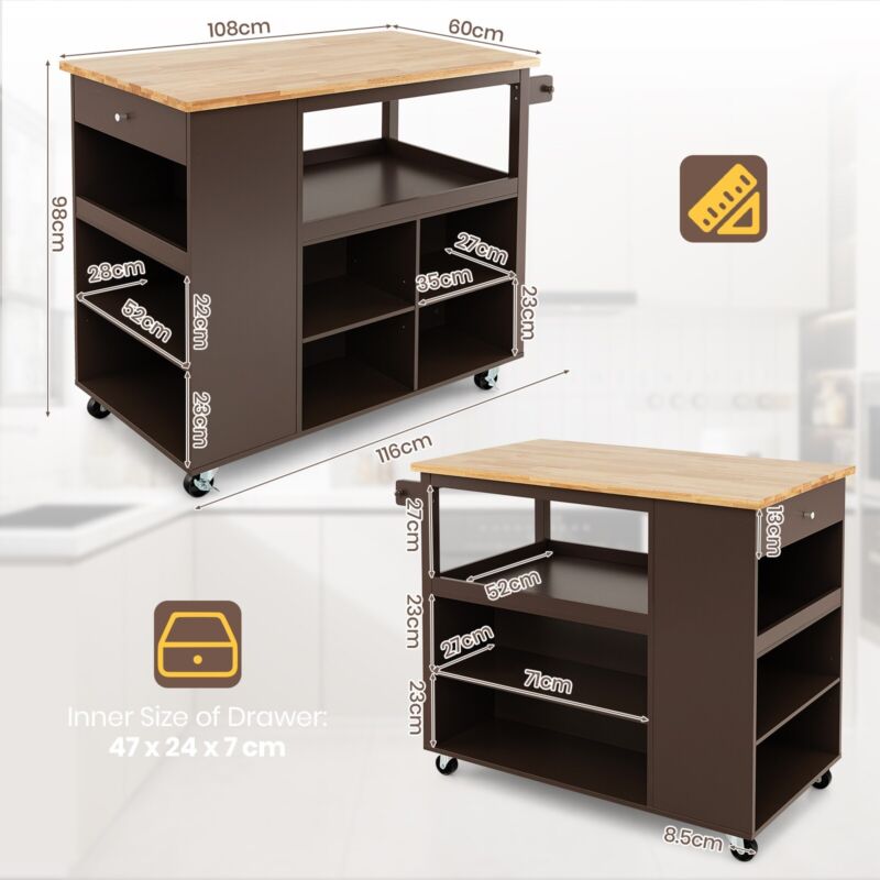 Features Rubber Wood Top, With 4 Adjustable Shelves, Drawer, With Spice Racks, Towel Rack