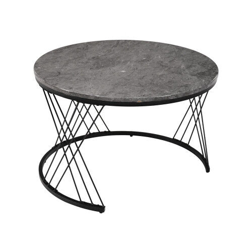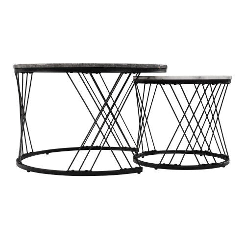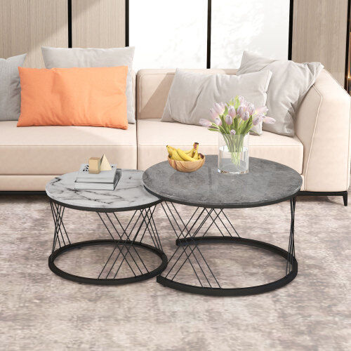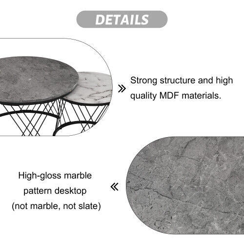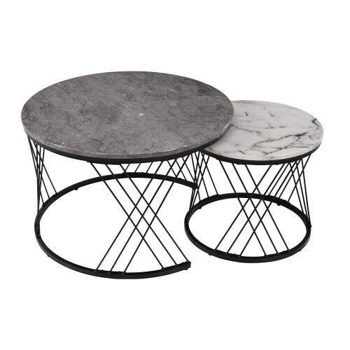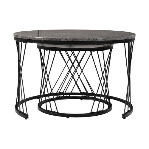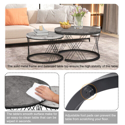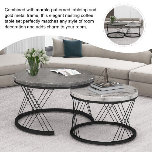 Round Coffee Table Set of 2 Side End Table Nesting Tables with Metal Frame BT