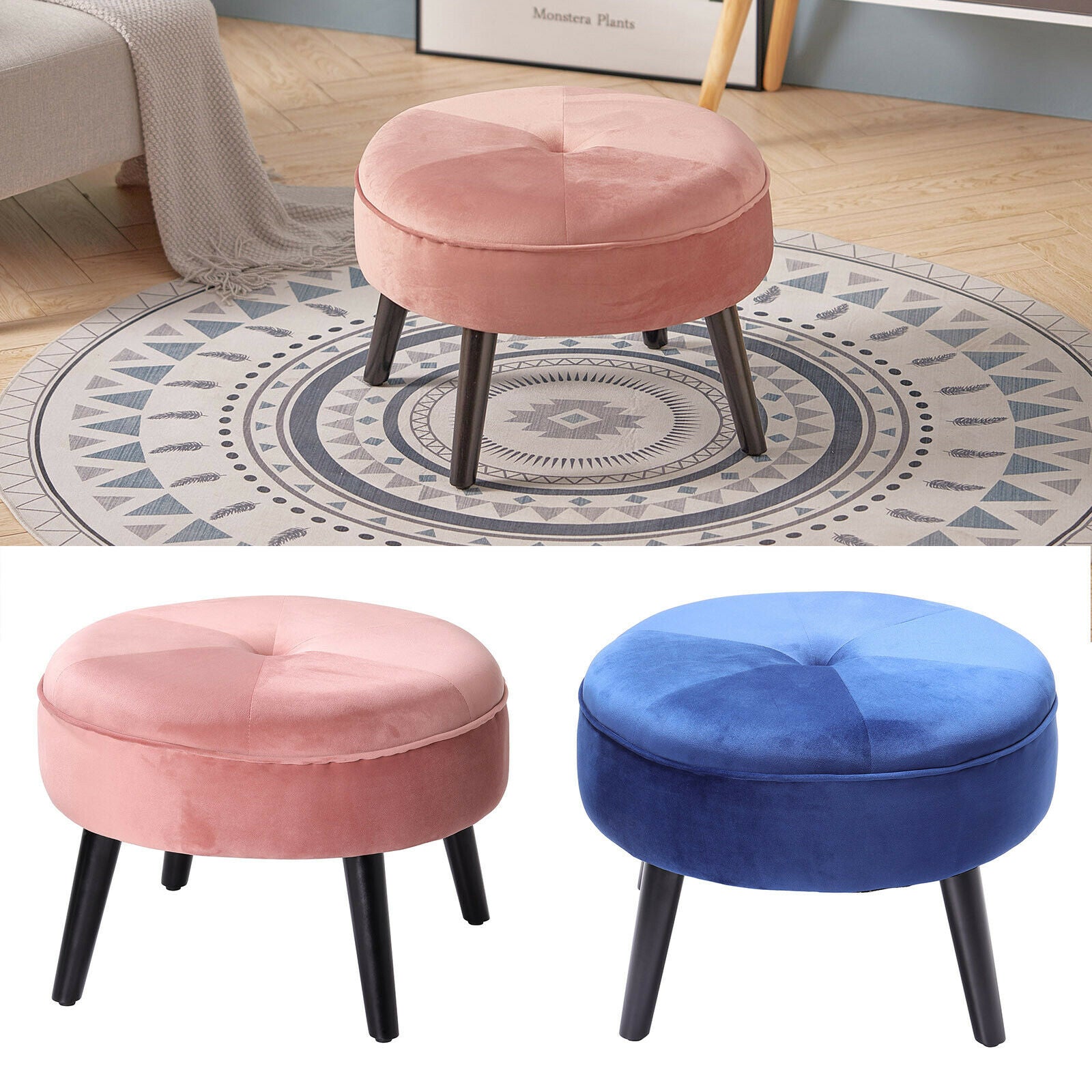 Round Footstool Ottoman Velvet Stool Padded Seat Footstool Wooden Legs Furniture