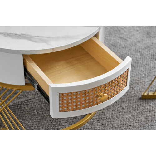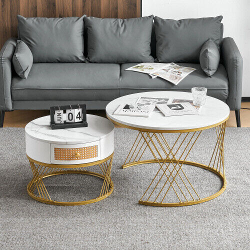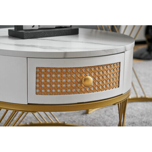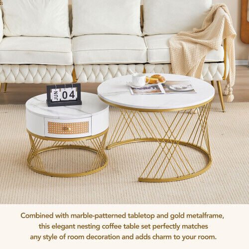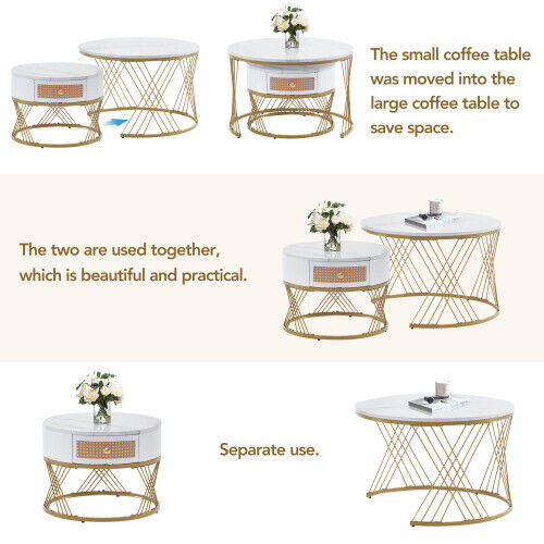 Round Nesting Coffee Table Set Modern Nesting Side End Table w/ Rattan Drawer HT