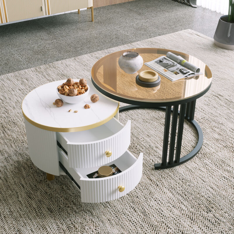 Round Nesting Coffee Table Set W/ 2 Drawer White Side Tables with Storage