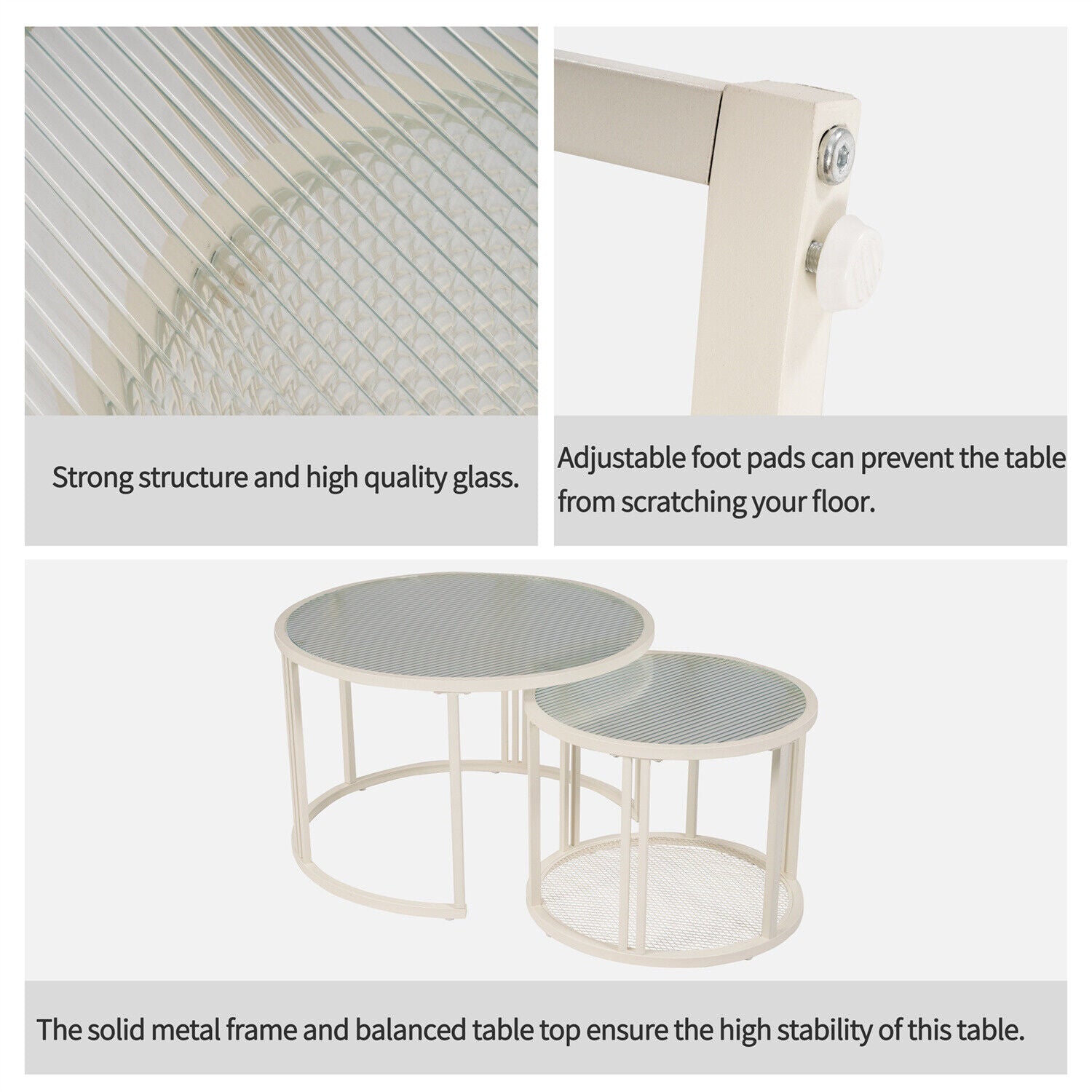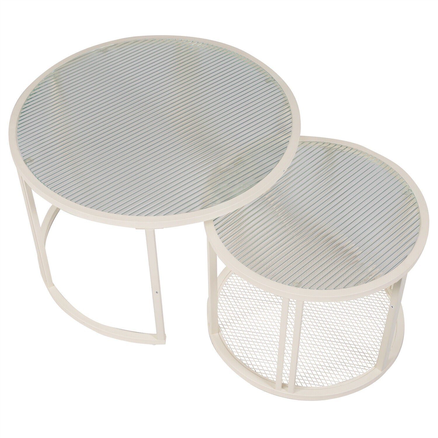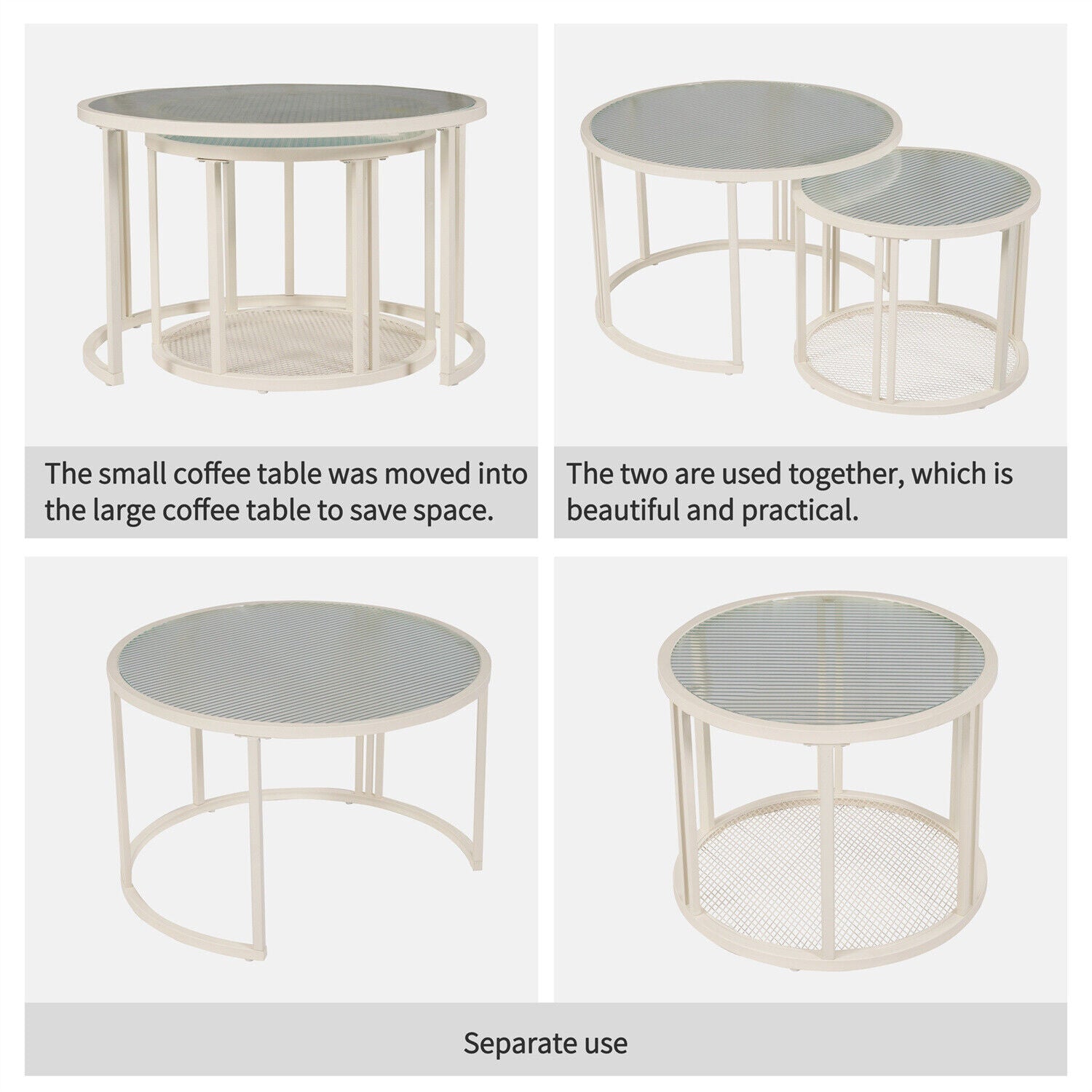 Round Nesting Coffee Tables Set of 2 Glass Top Side End Tables with Metal Frame