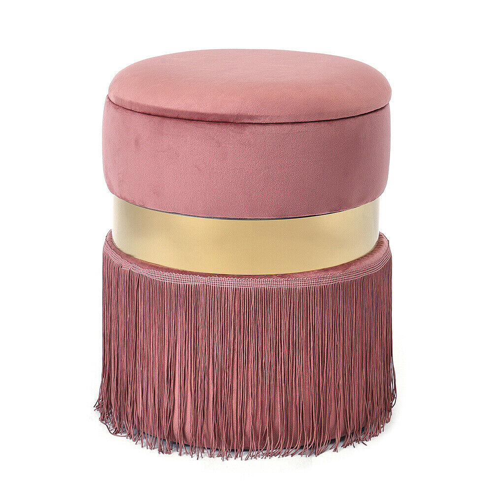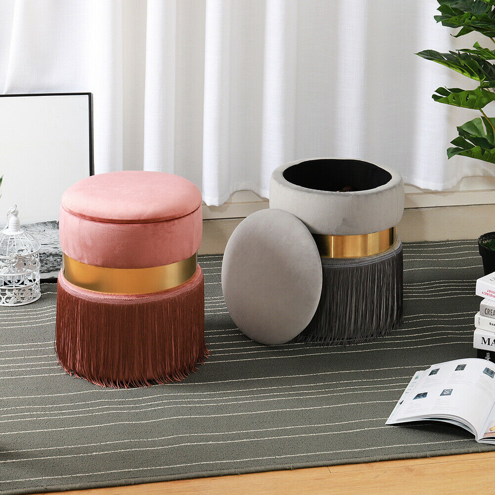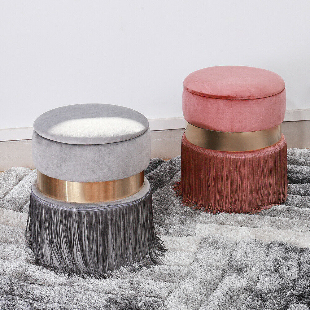 Round Ottoman Storage Box Stool Velvet Padded Tassel Dressing Table Vanity Chair