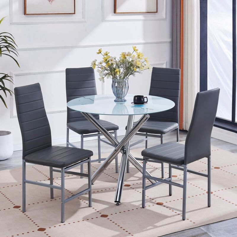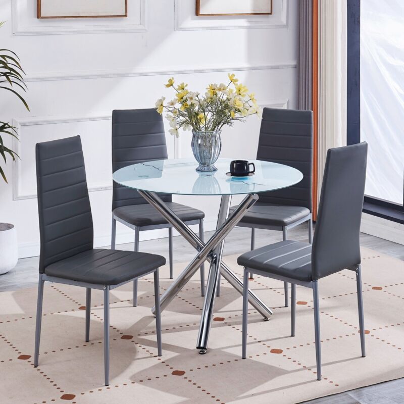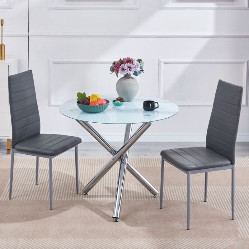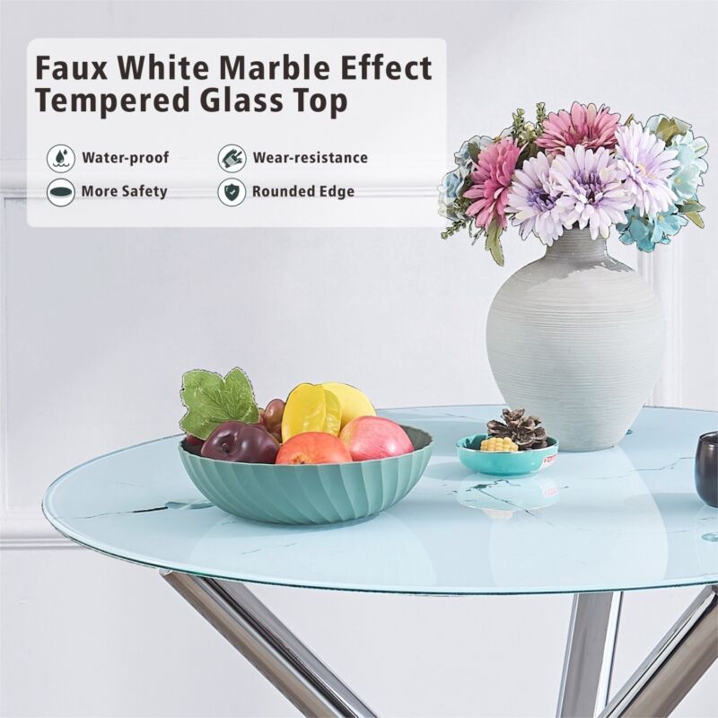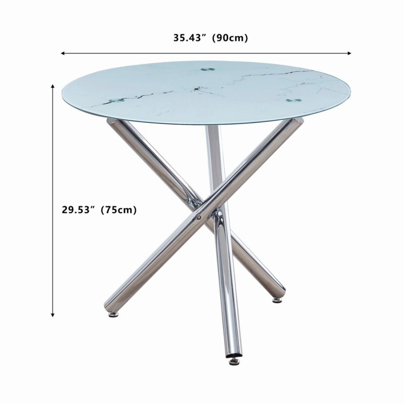 Round White Marble Tempered Glass Dining Table Silver Chromed Legs Dining Room