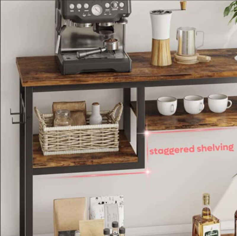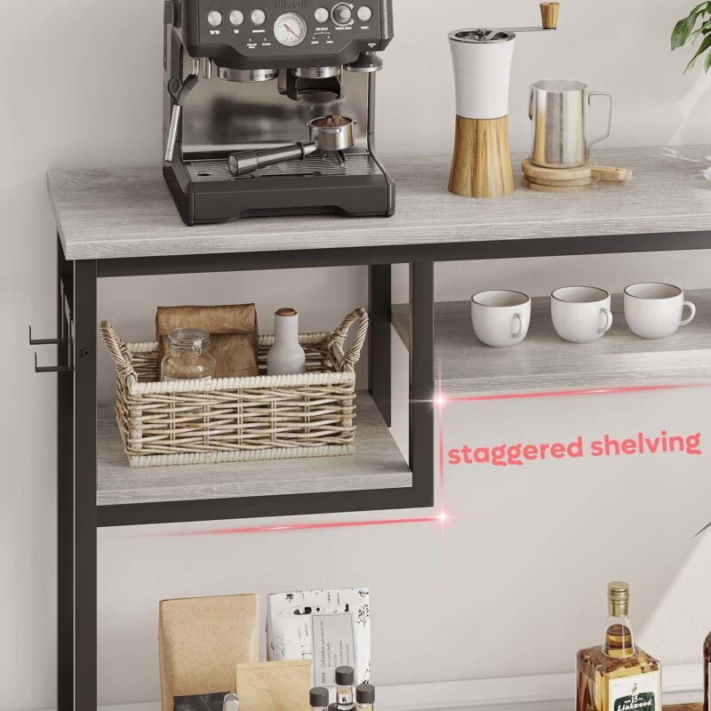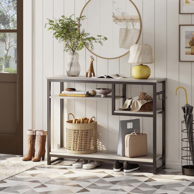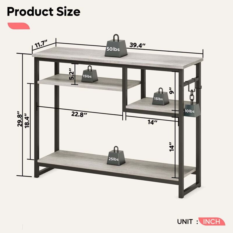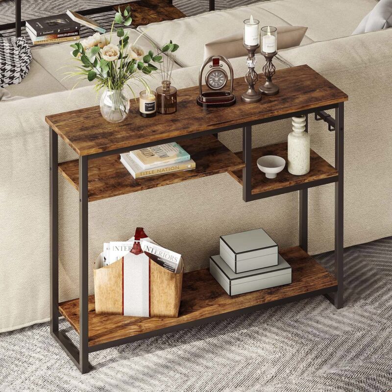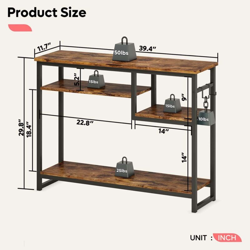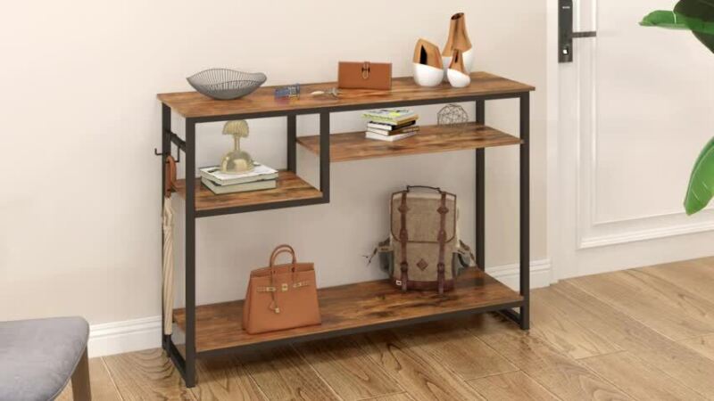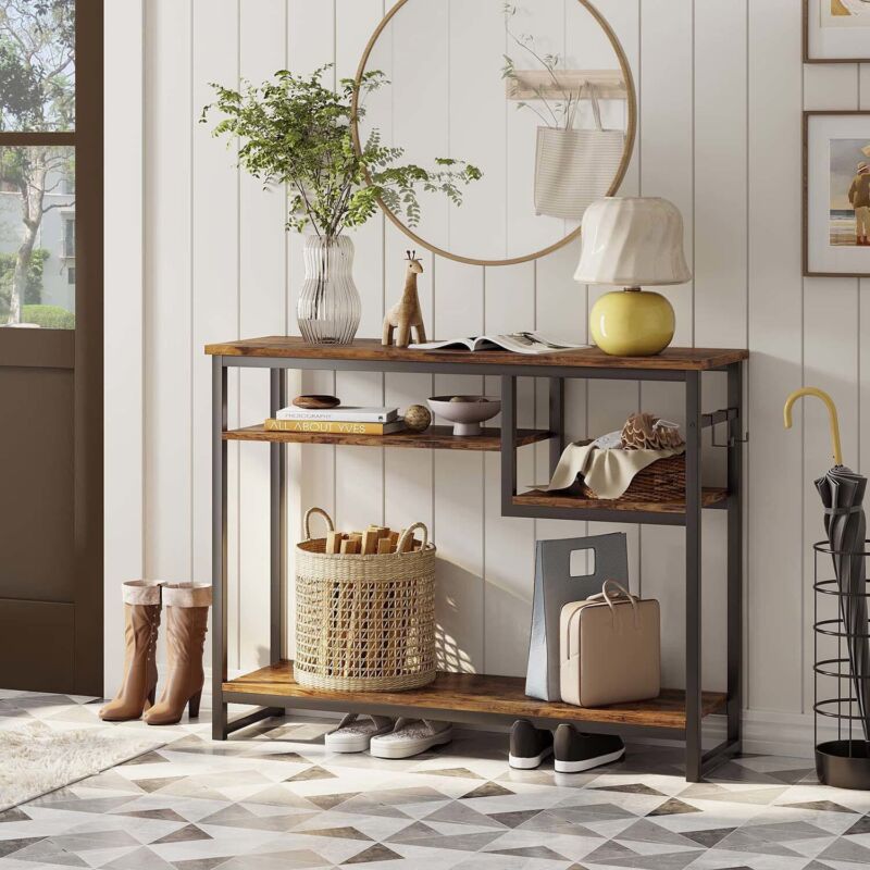 Rustic Console Table Console 4 Storage Shelves Cupboard Server Table with Hooks