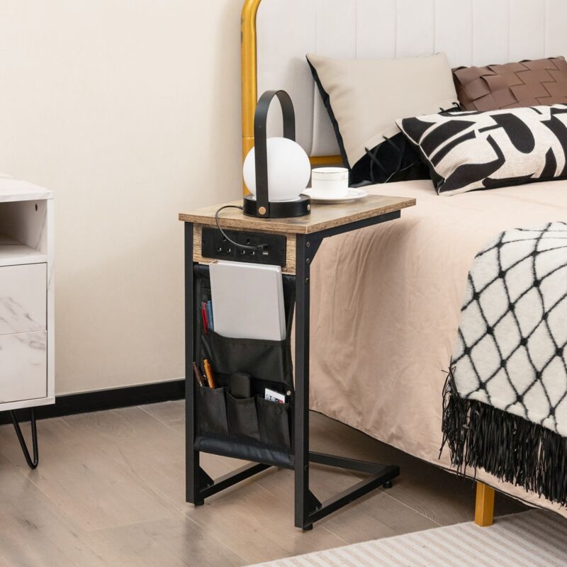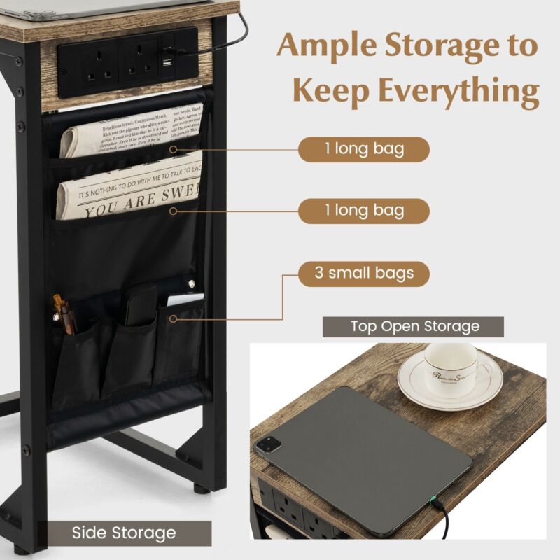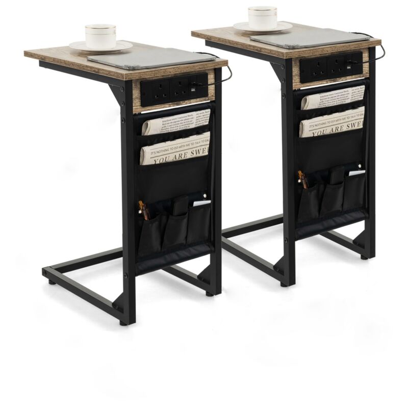 Set of 2 C-Shaped End Table Sofa Side Table W/ Charging Station & Side Storage