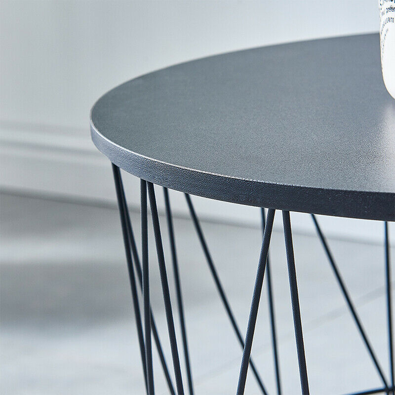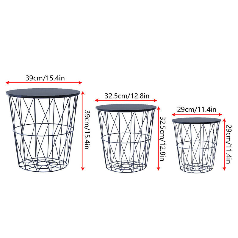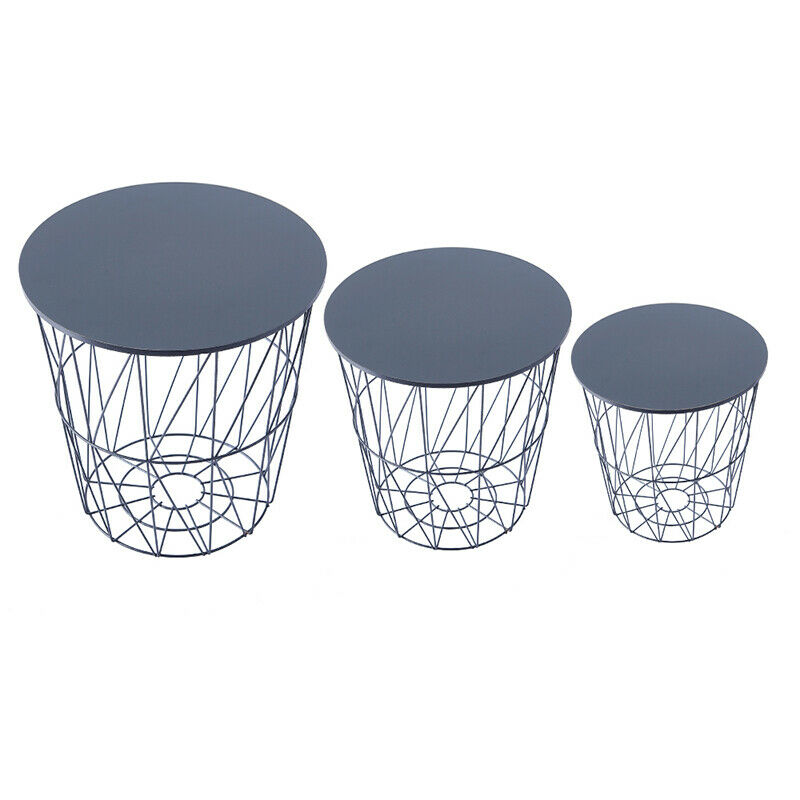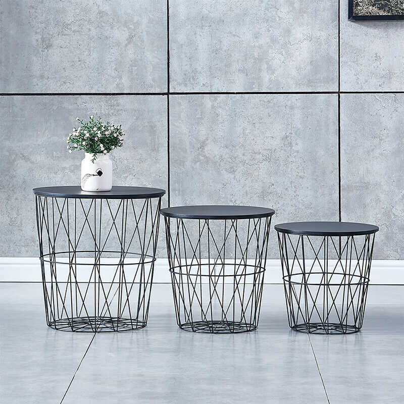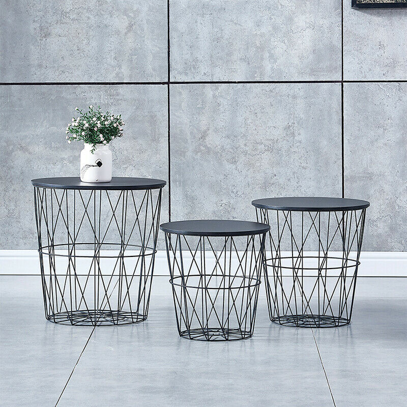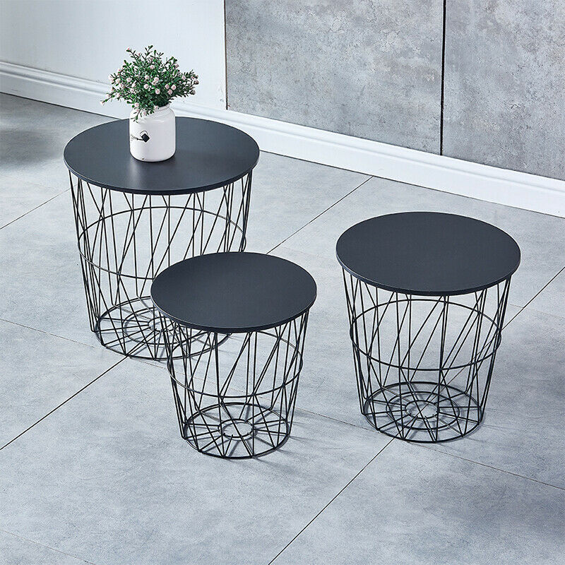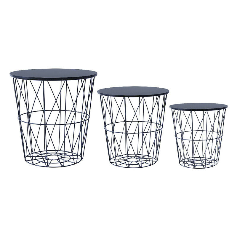 Set of 3 Storage Basket Nested Tables Side Table Metal Wire Black Tabletop Home