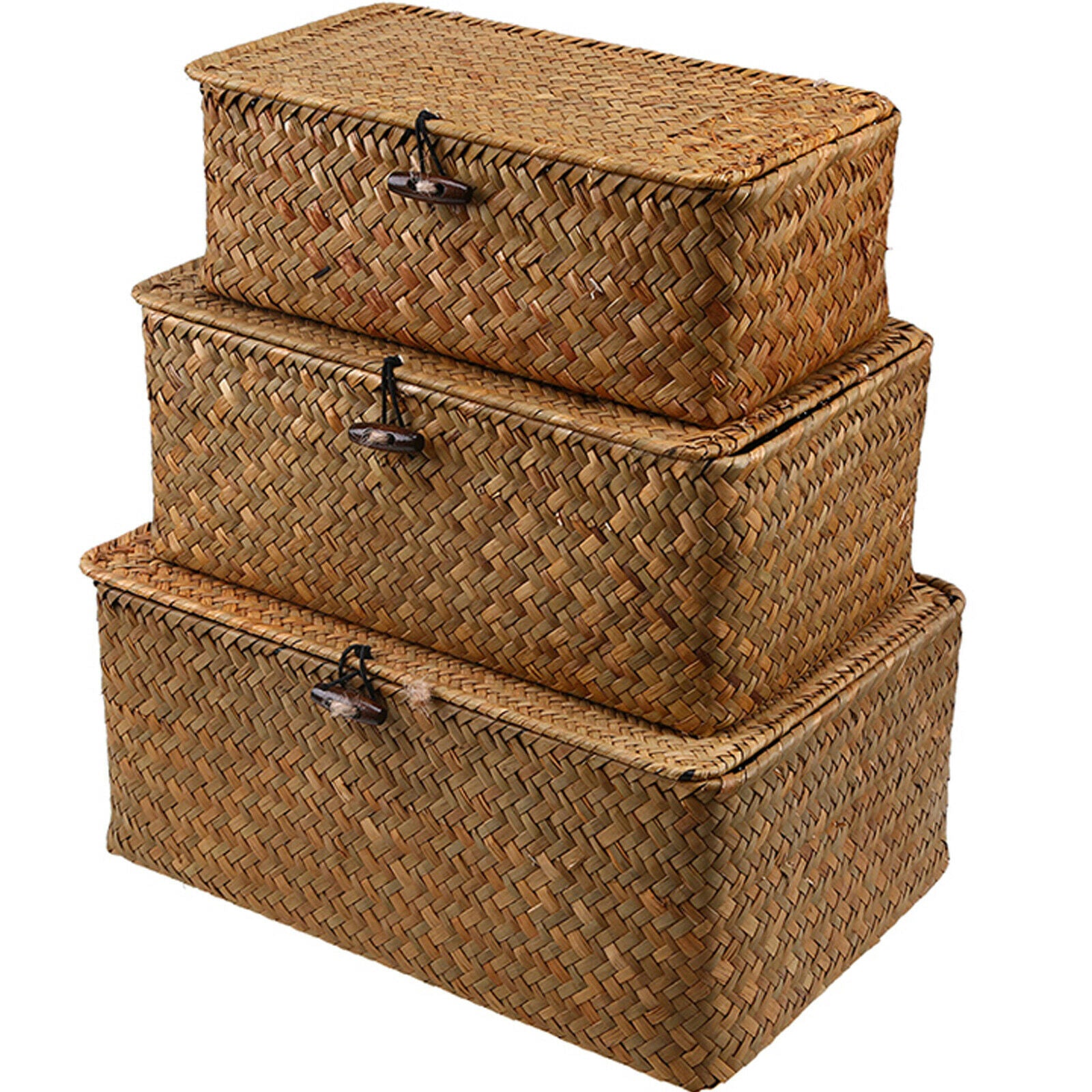 Set of 3 Storage Basket Organiser Box With Lid Hamper Seaweed Resin Woven Home