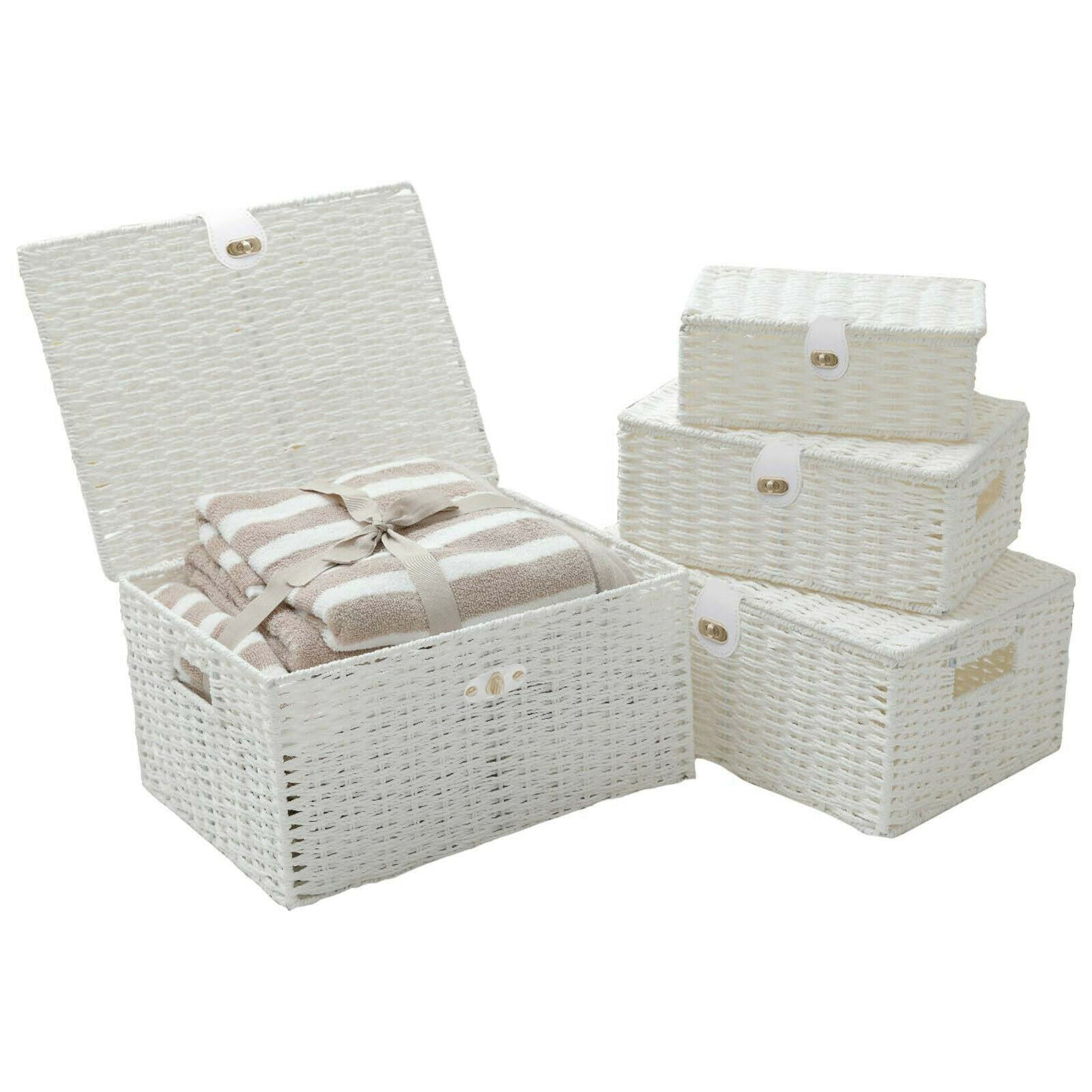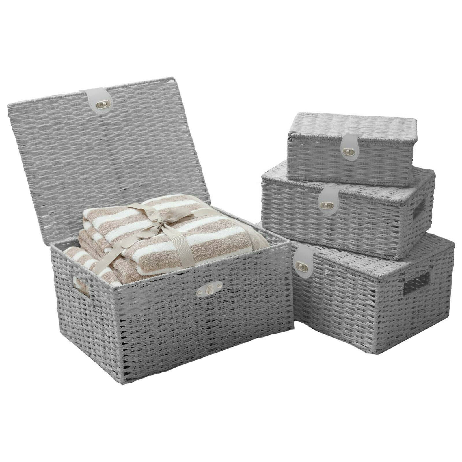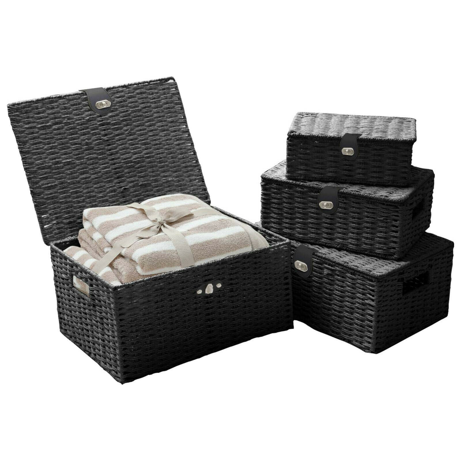 Set of 3 Storage Basket Resin Wicker Woven Hamper Box With Lid & Lock Stackable