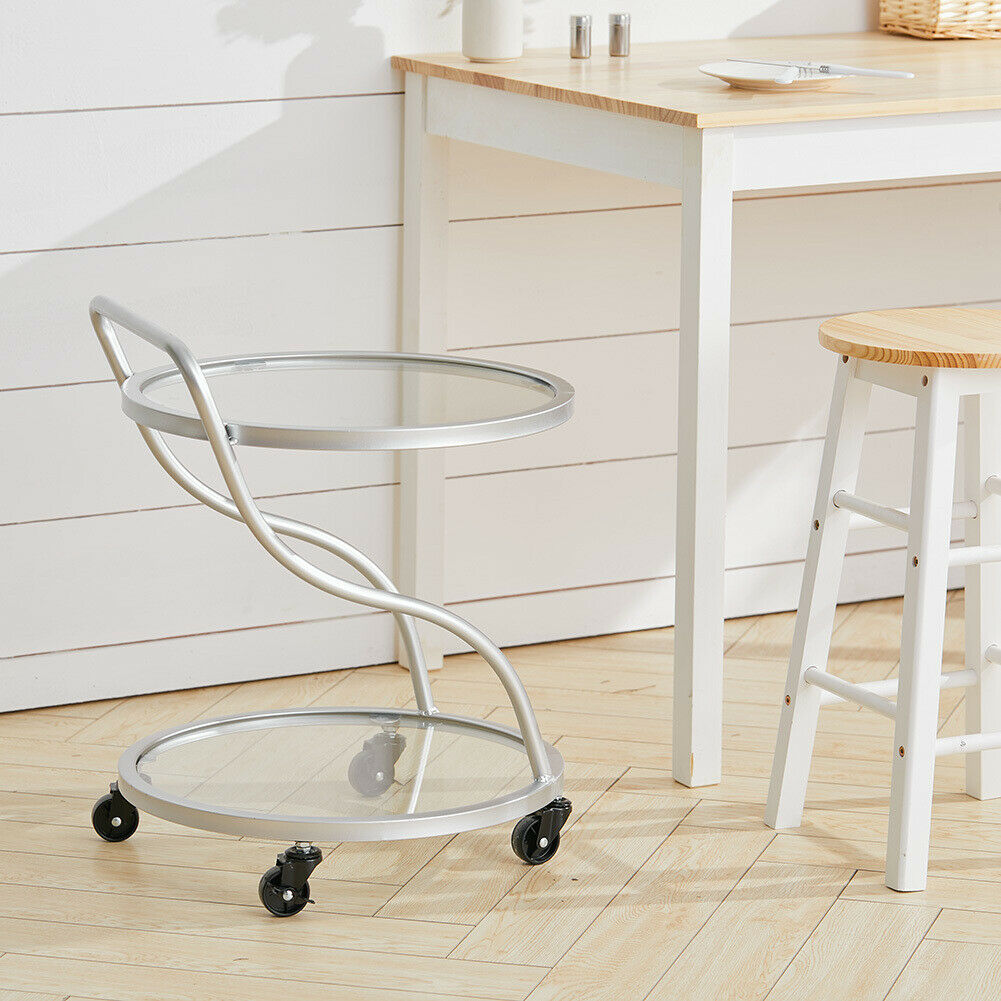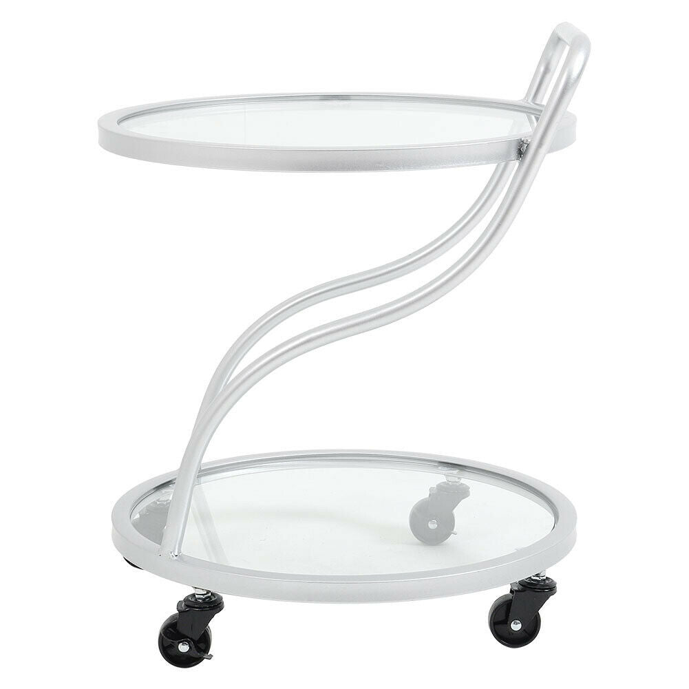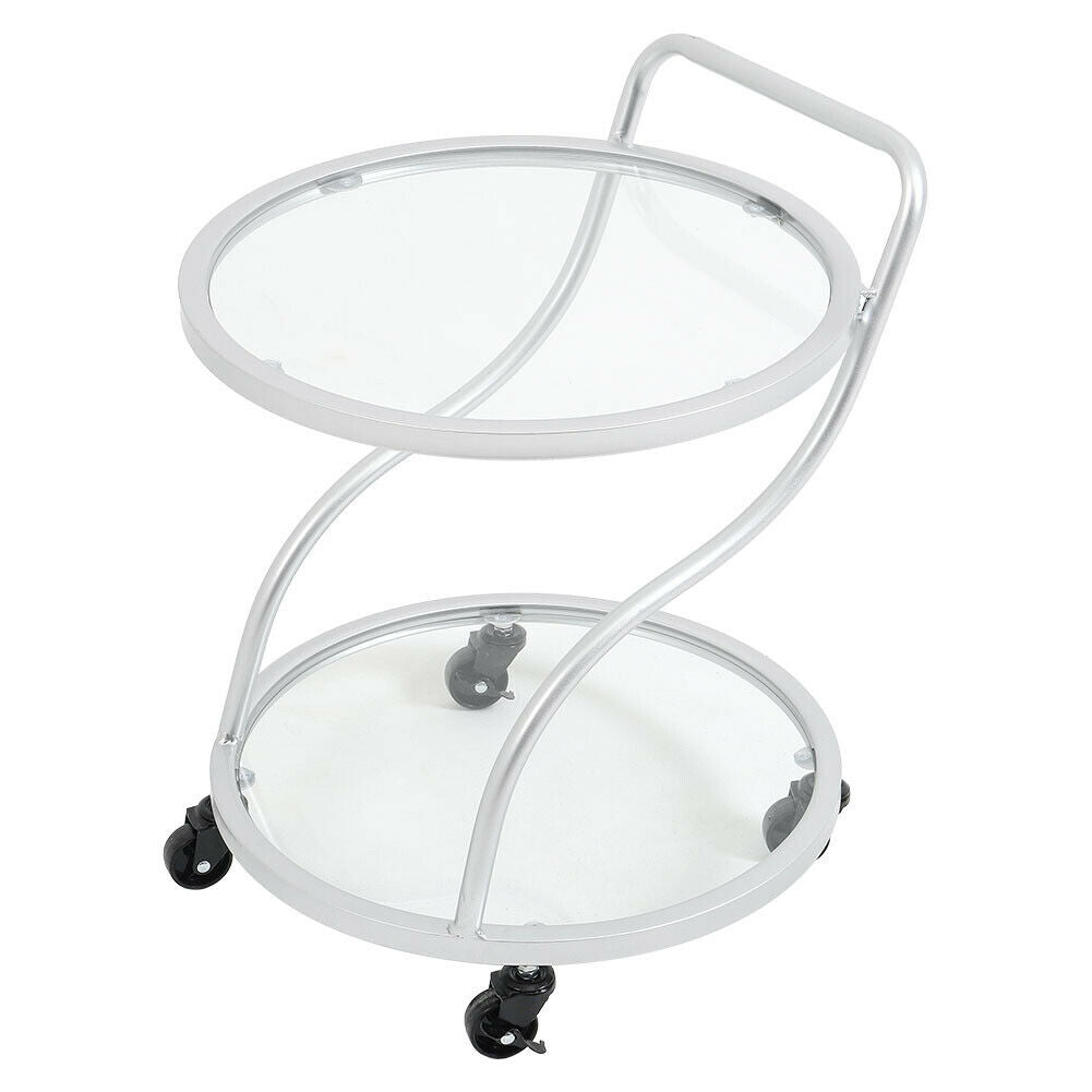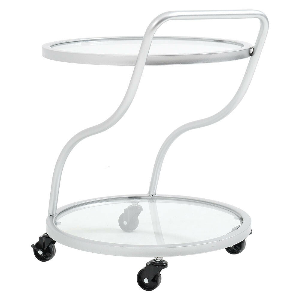 Silver Drinks Trolley 2 Tier Glass Shelves Wine Food Holder Serving Cart Home