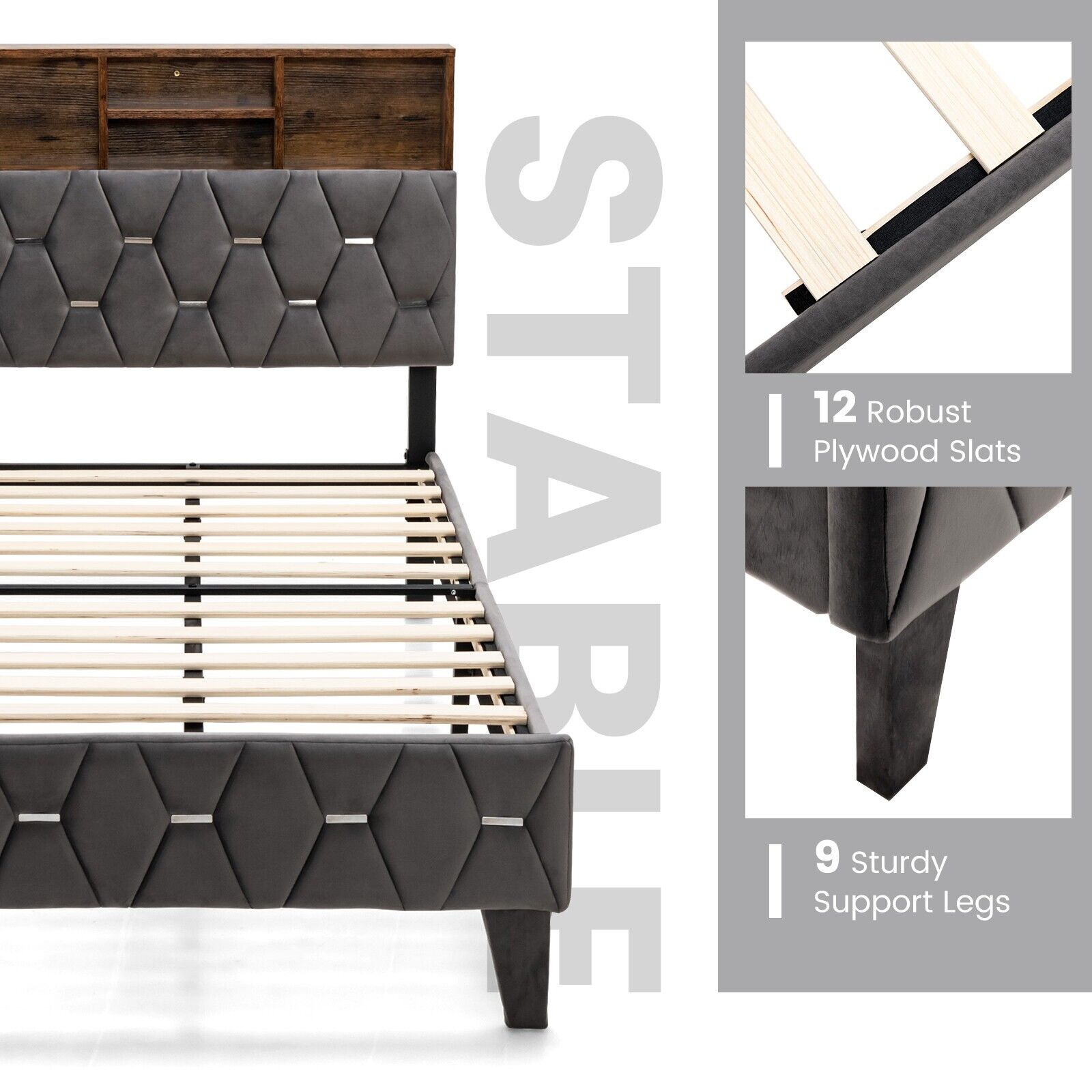Single Size Bed Frame Upholstered Platform Bed Slat Support W/ Storage Headboard