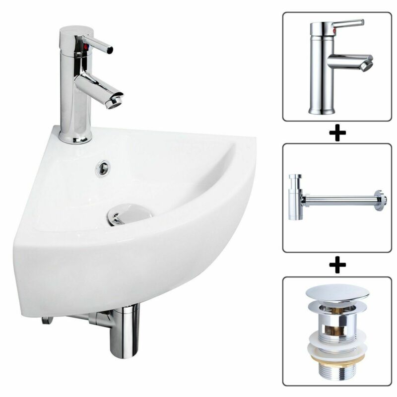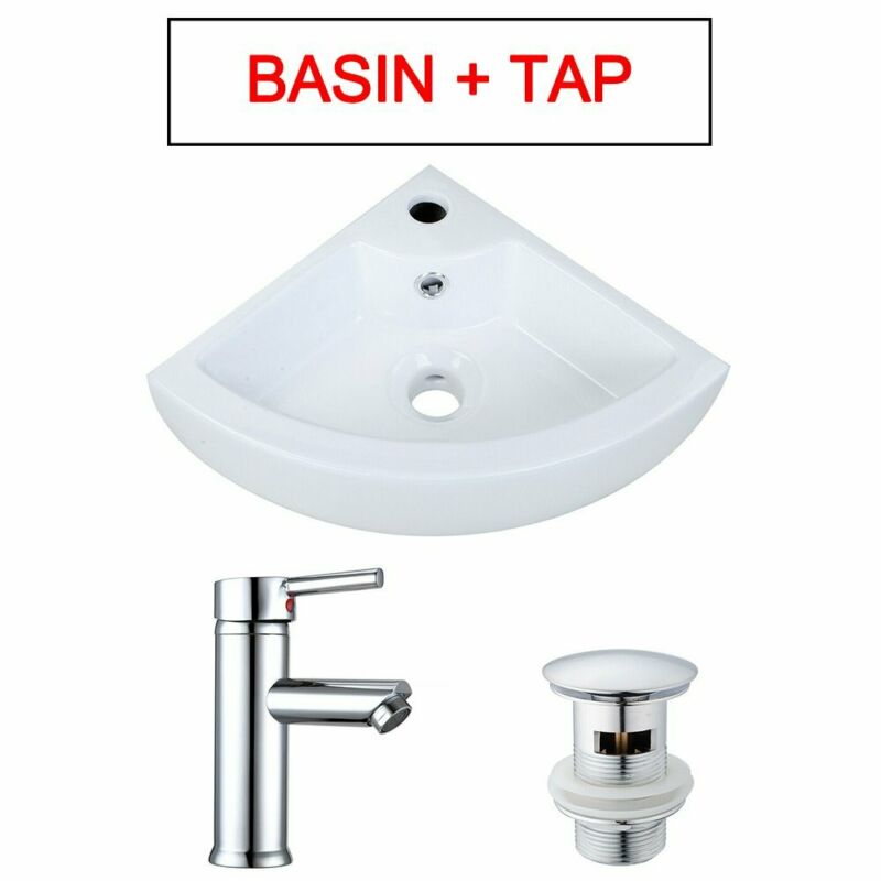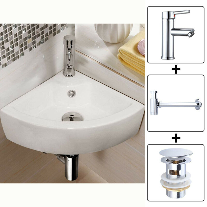 Small Corner Ceramic Cloakroom Basin Hand Wash Wall Mounted Bathroom Sink + Tap