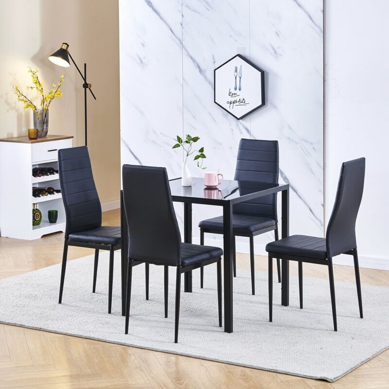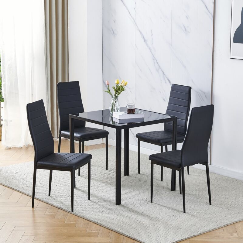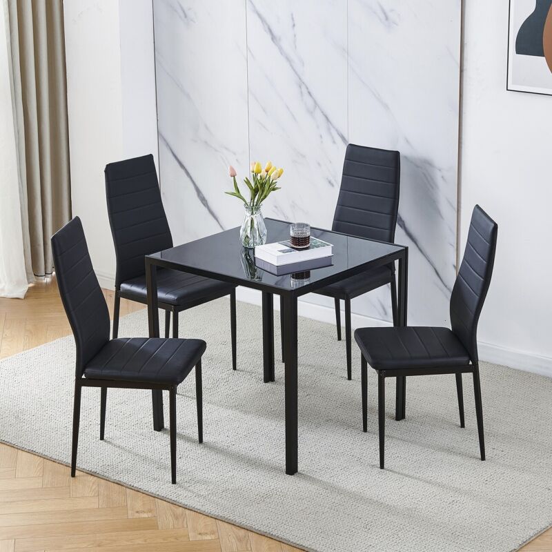 Small Space Dining Set 5Pcs Square Black Glass Dining Table+ 4 Dining Chairs Set
