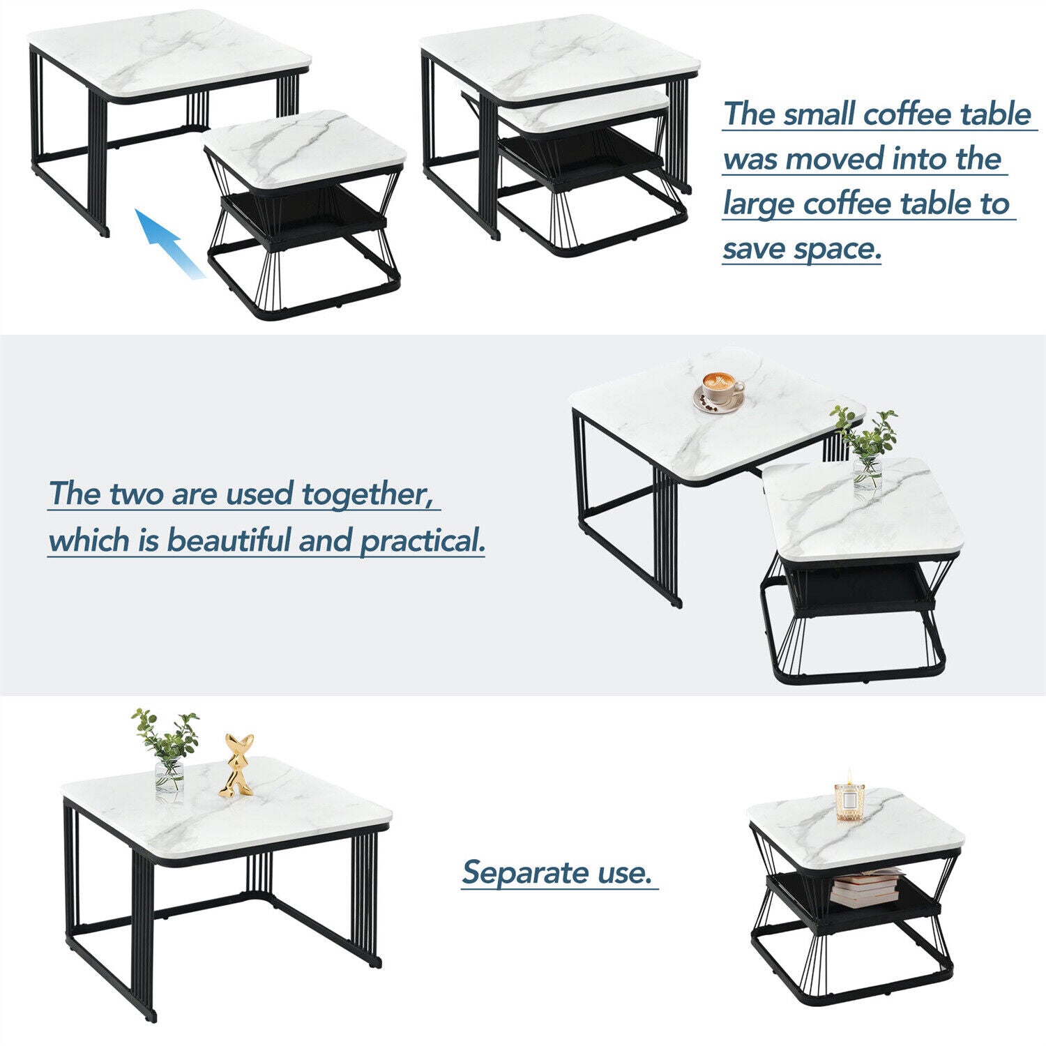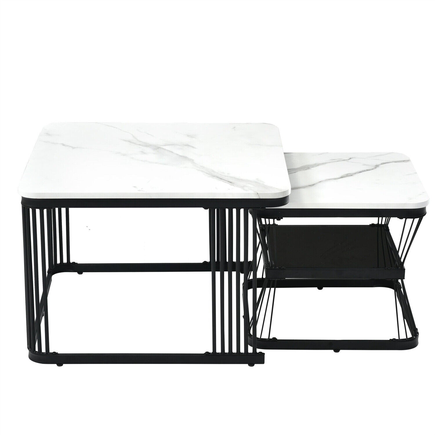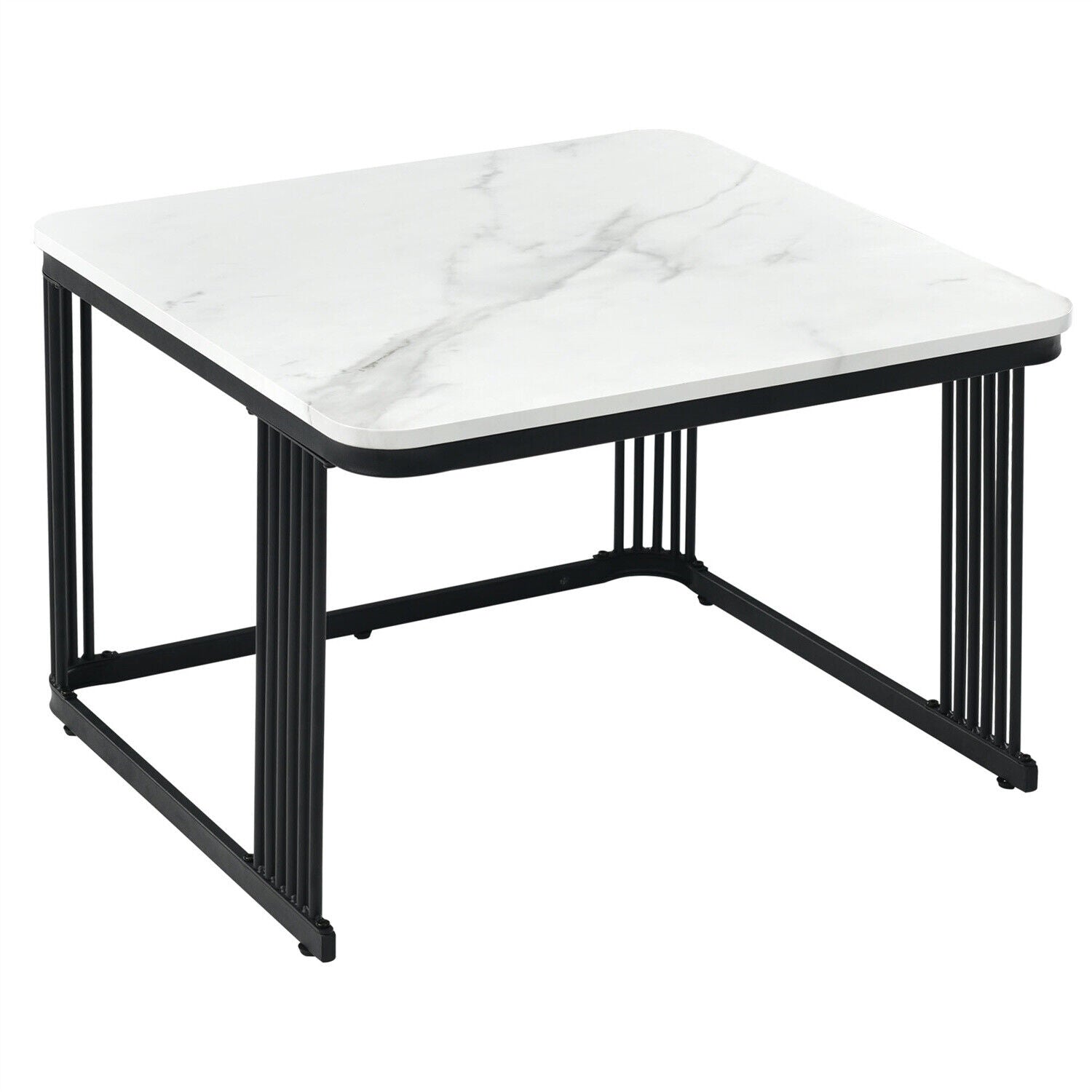 Square Nesting Coffee Table Metal Stacking Side Tables Set Marble-Look White