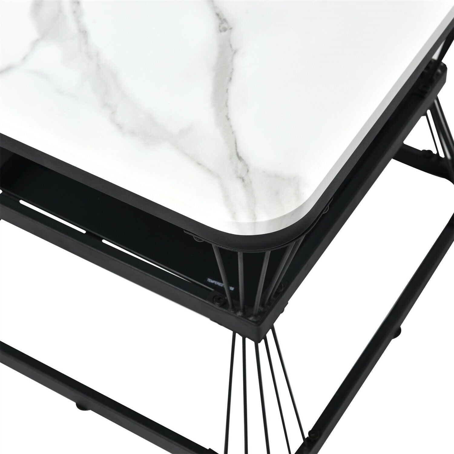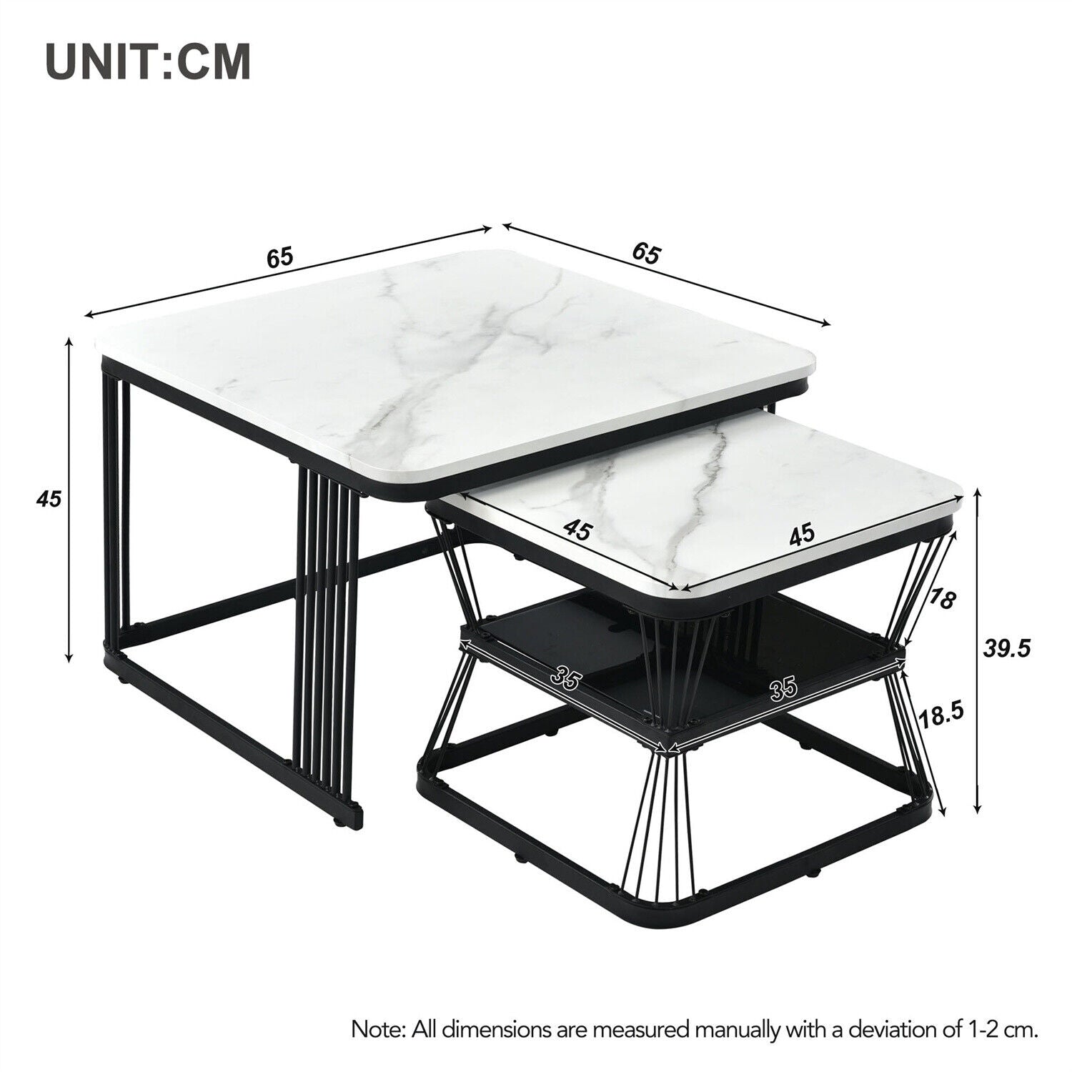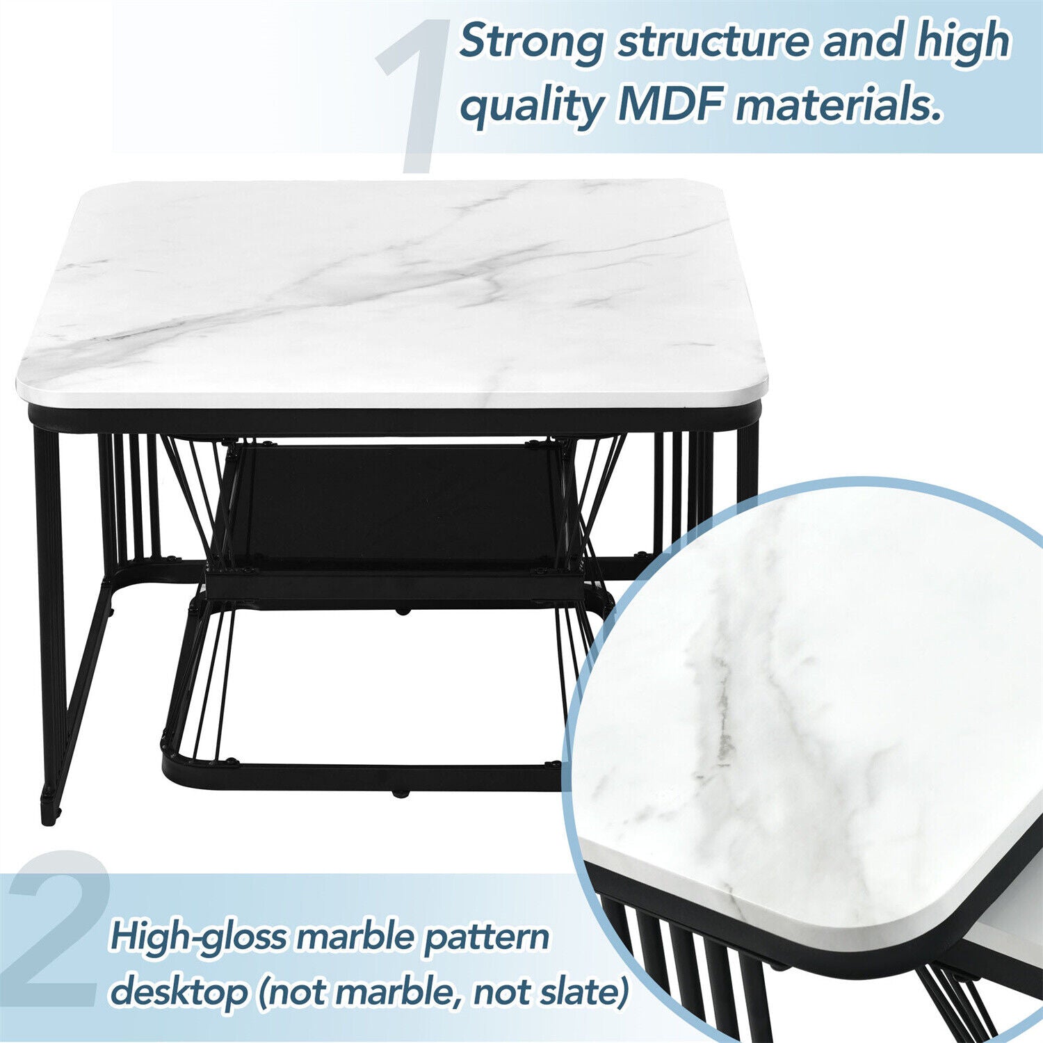Square Nesting Coffee Table Metal Stacking Side Tables Set Marble-Look White
