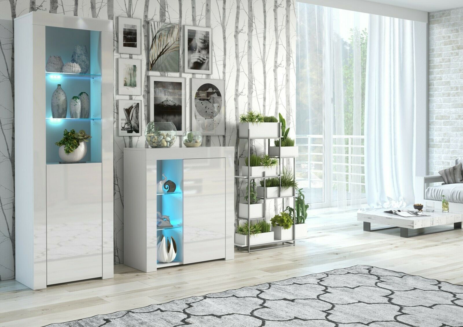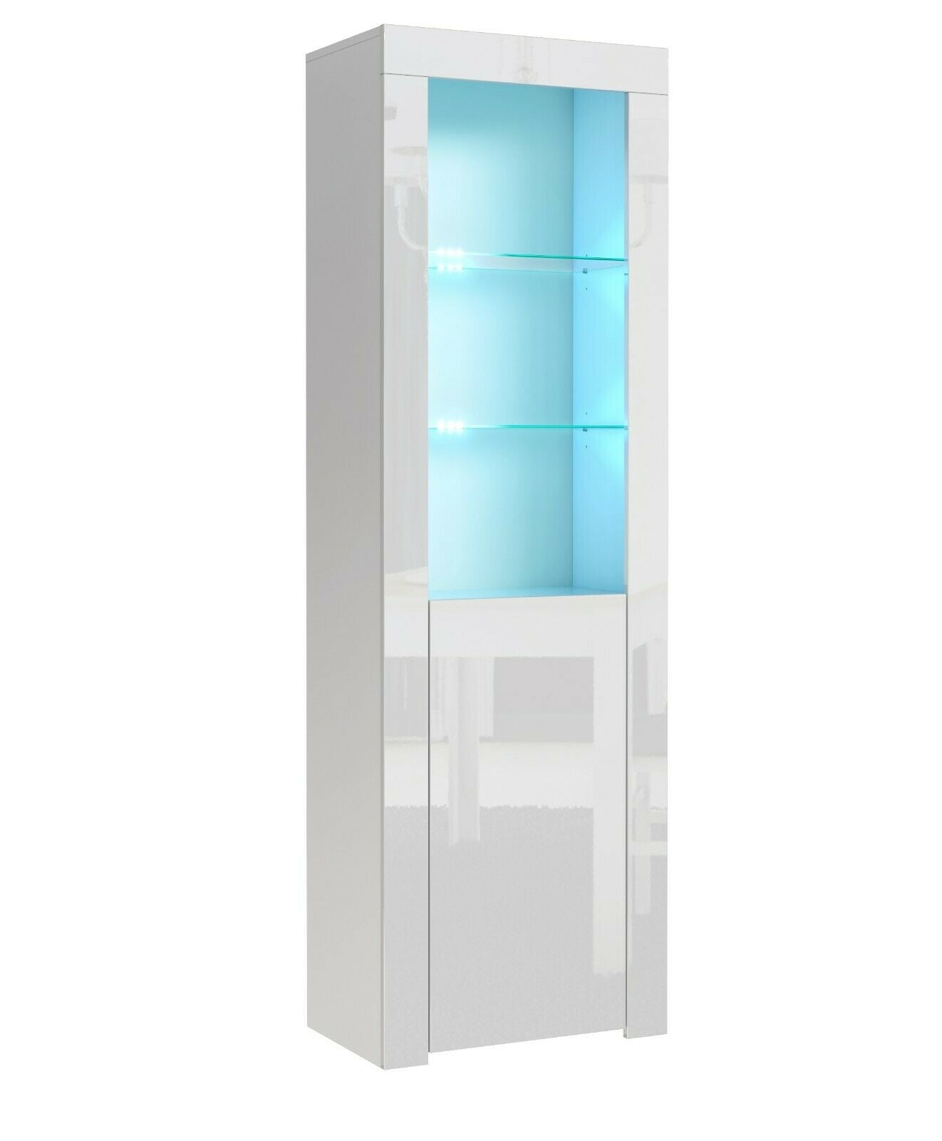 Tall White Gloss Display Glass Cabinet Shelving Bookcase Door Unit Blue LED Lily