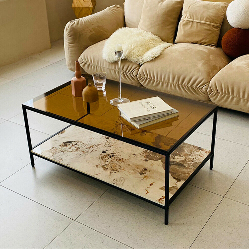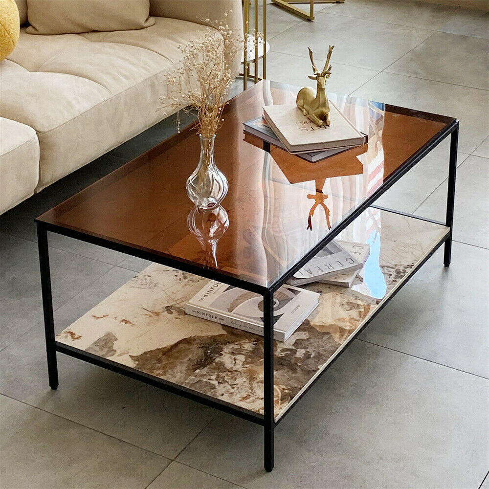Thicken Glass Marble Coffee Table Rectangular Living Room Table Storage Shelf