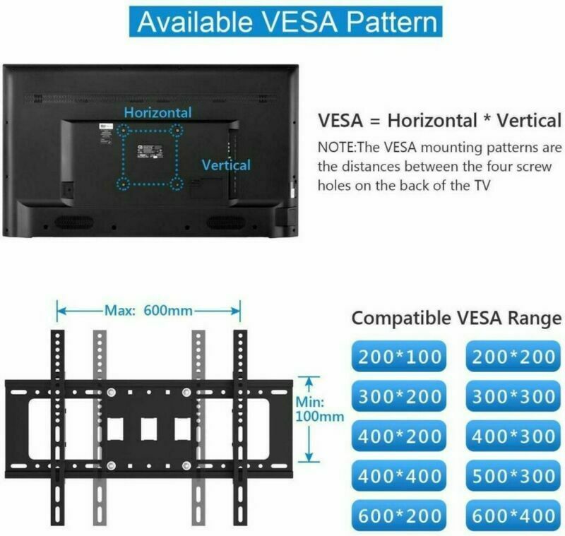 - Vesa Size: 100x100mm 200x200mm 400x200mm 400x400mm 600x400m
