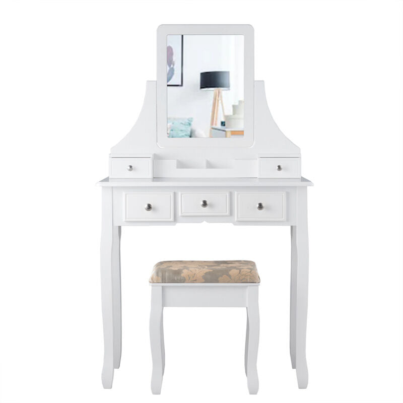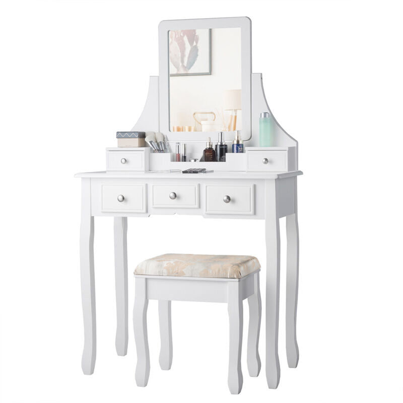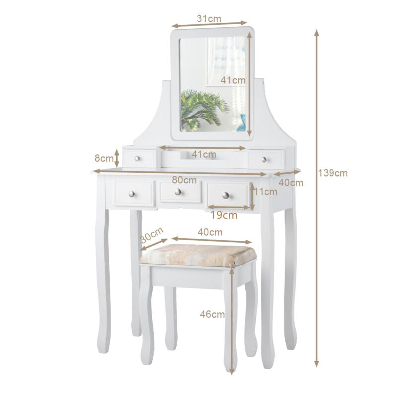 Vanity Dressing Table 5 Drawers Make Up Desk Padded Stool Set W/ Rotating Mirror