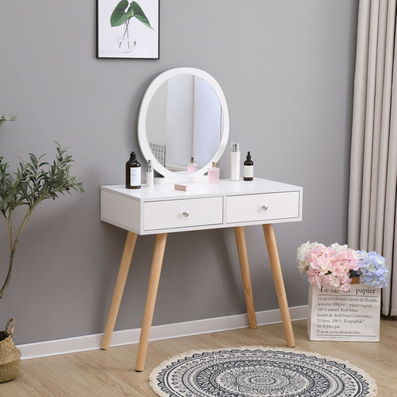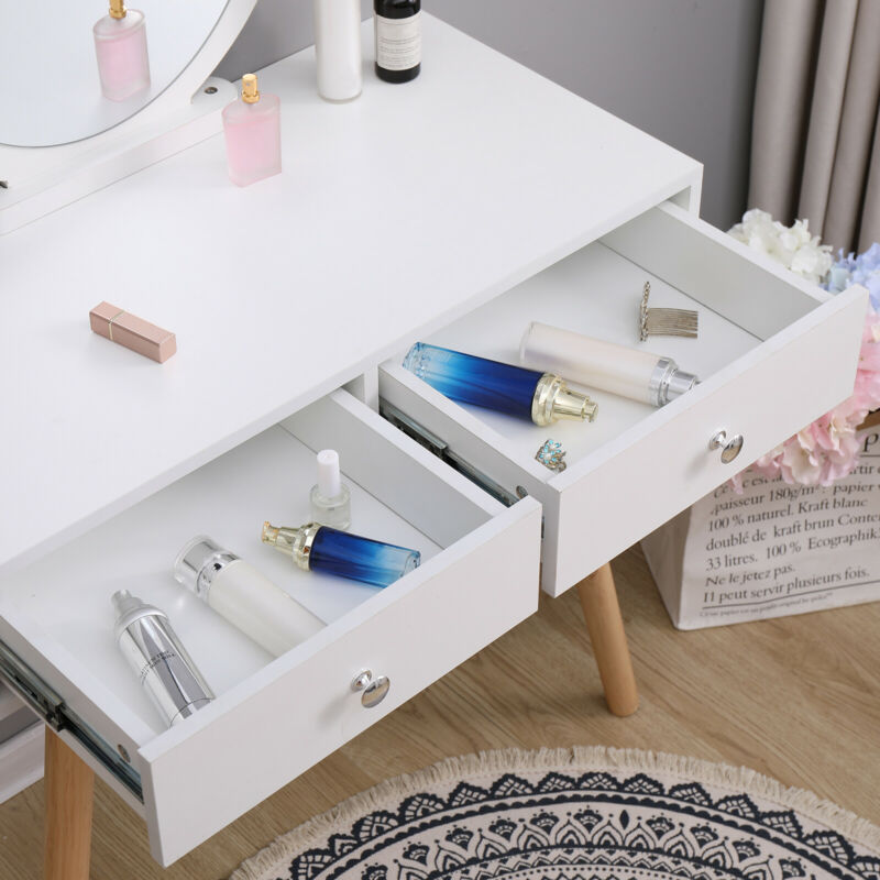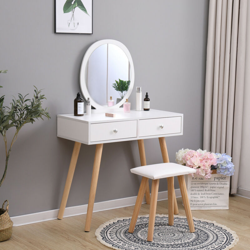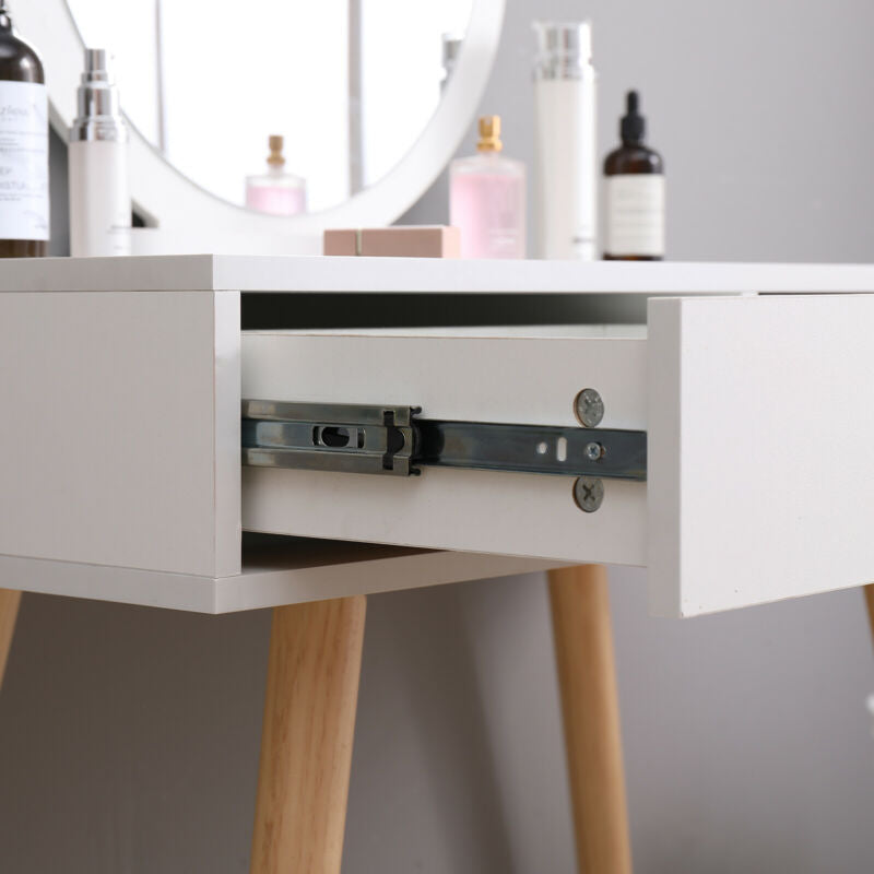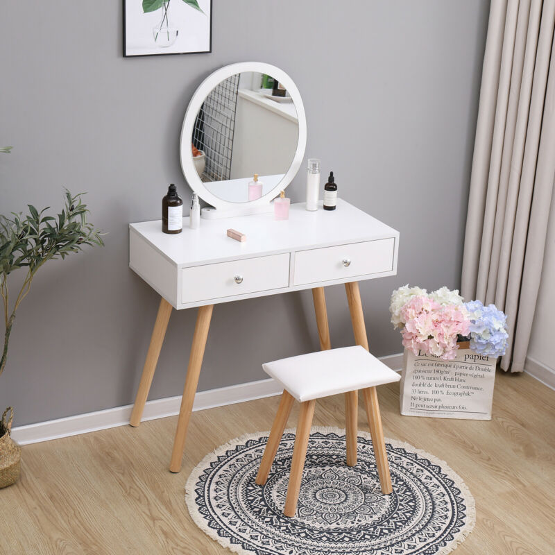 Vanity Dressing Table Makeup Desk w/ Round Mirror&2 Drawers,Stool White Bedroom
