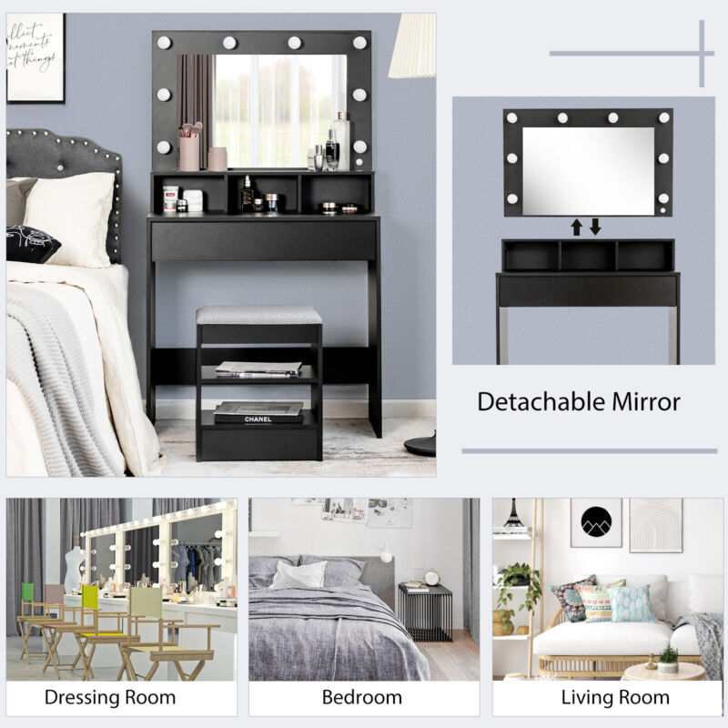 Vanity Table Set Large Makeup Dressing Desk w/ Lighted Mirror and Storage Stool