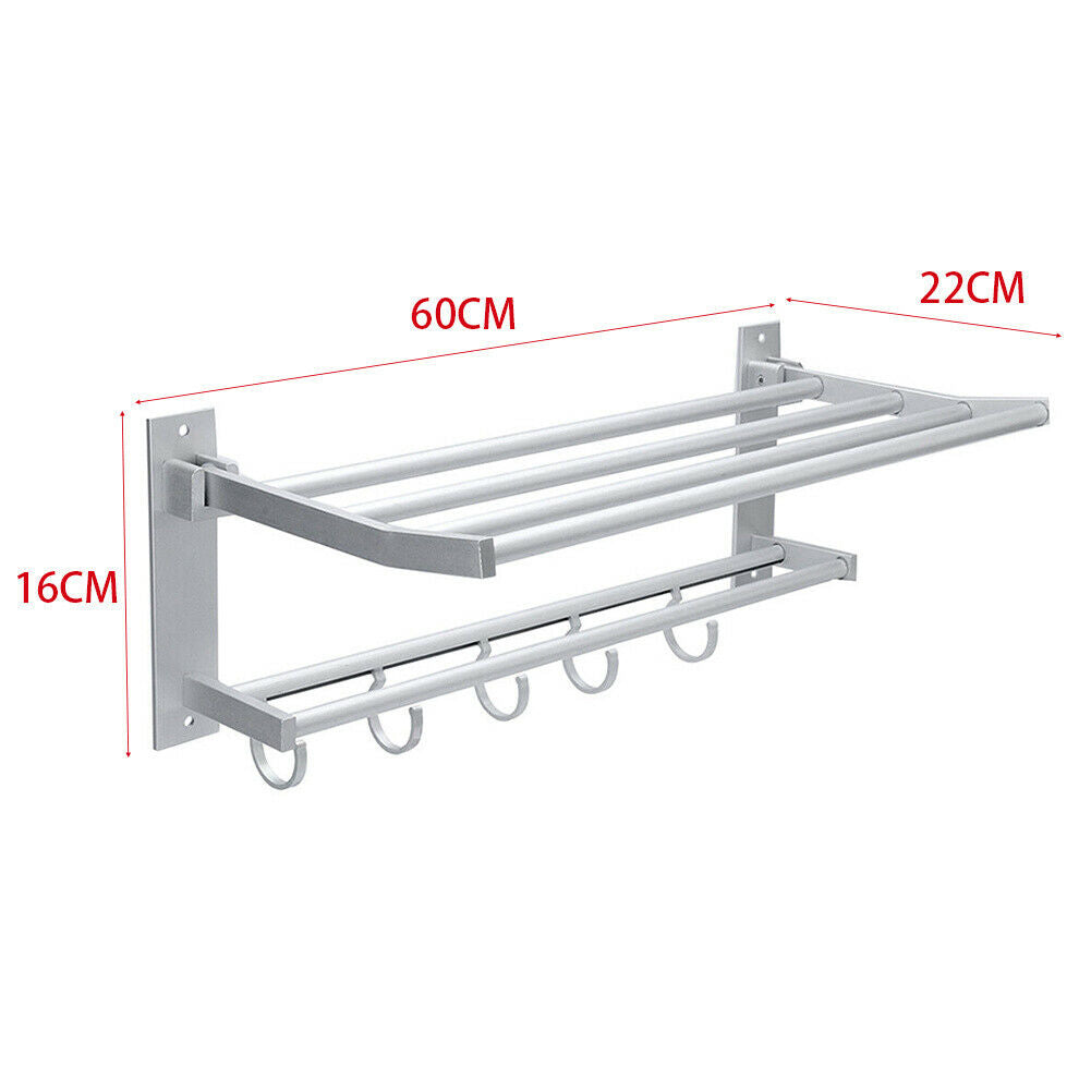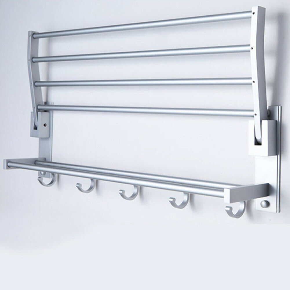 Wall Mounted Towel Rail Foldable Bathroom Towel Holder Shelf Storage Rack Hooks