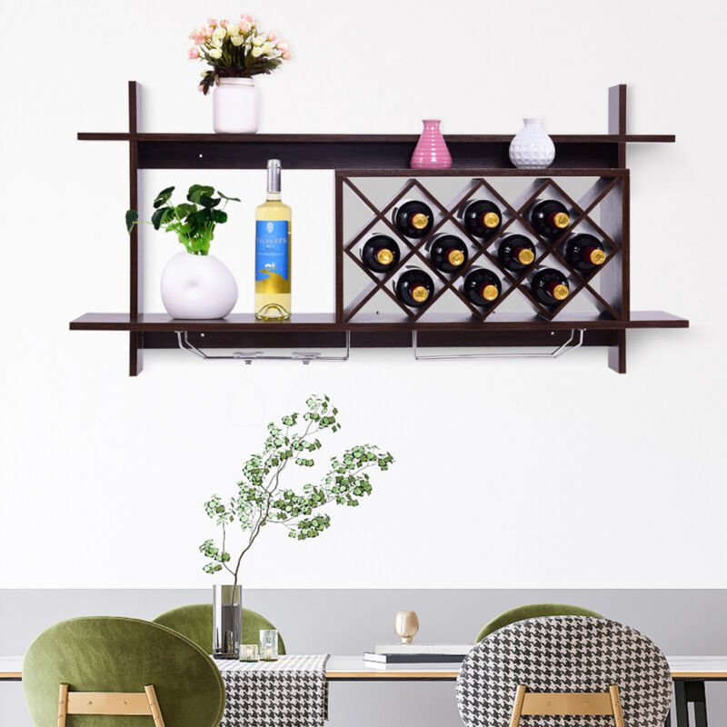 Wall-Mounted Wine Rack Wooden Wine Bottle Holder for 10 Bottles 6 Wine Glasses