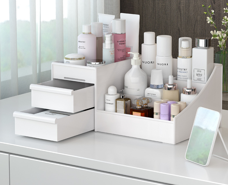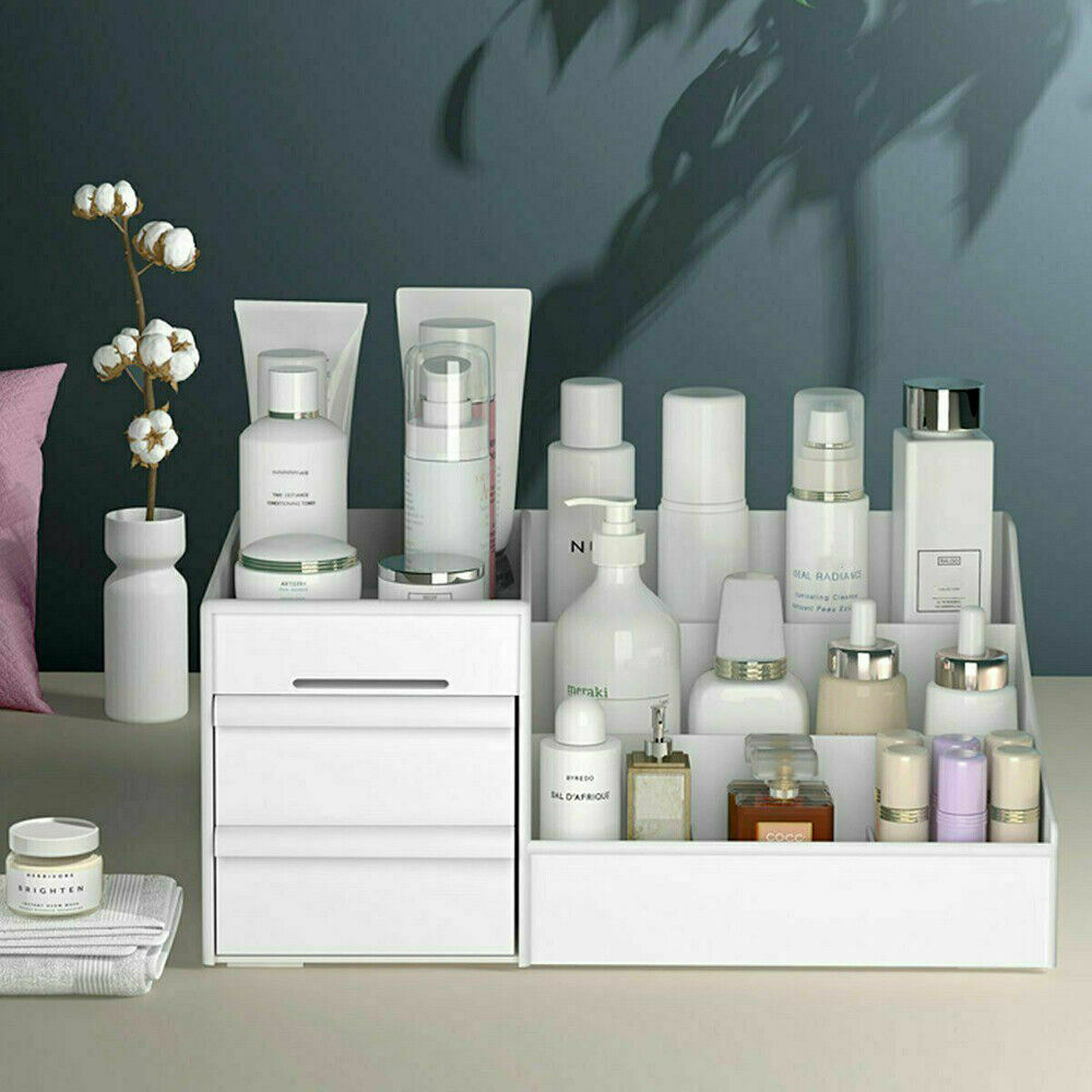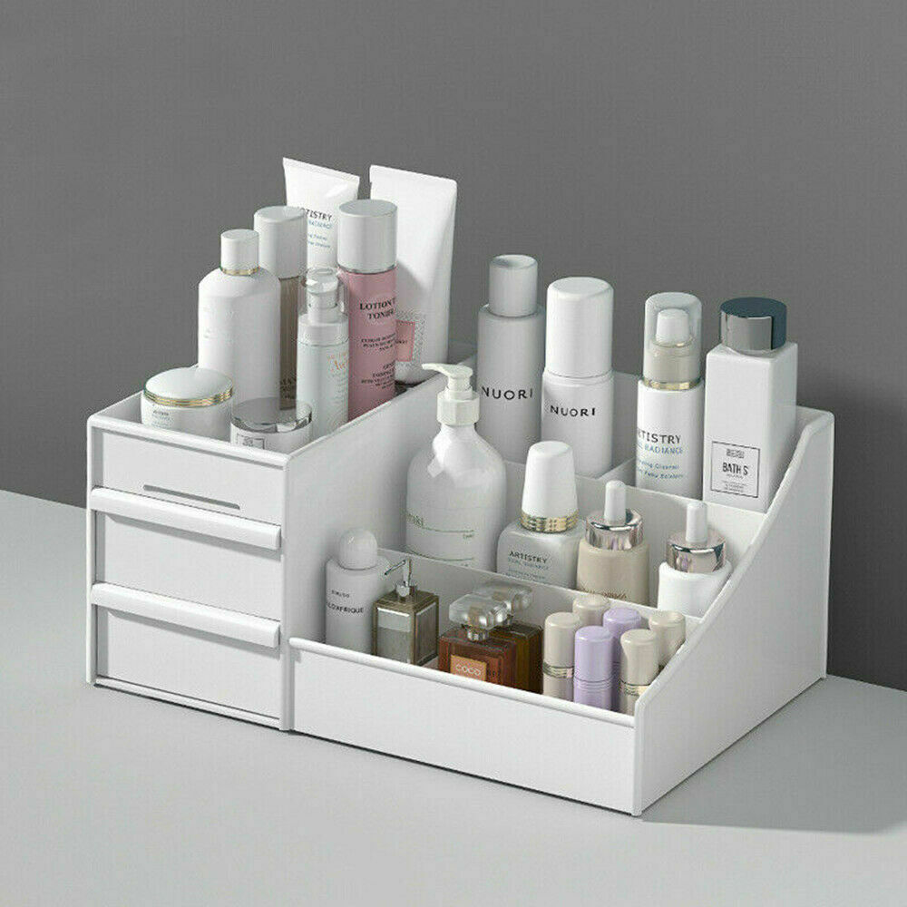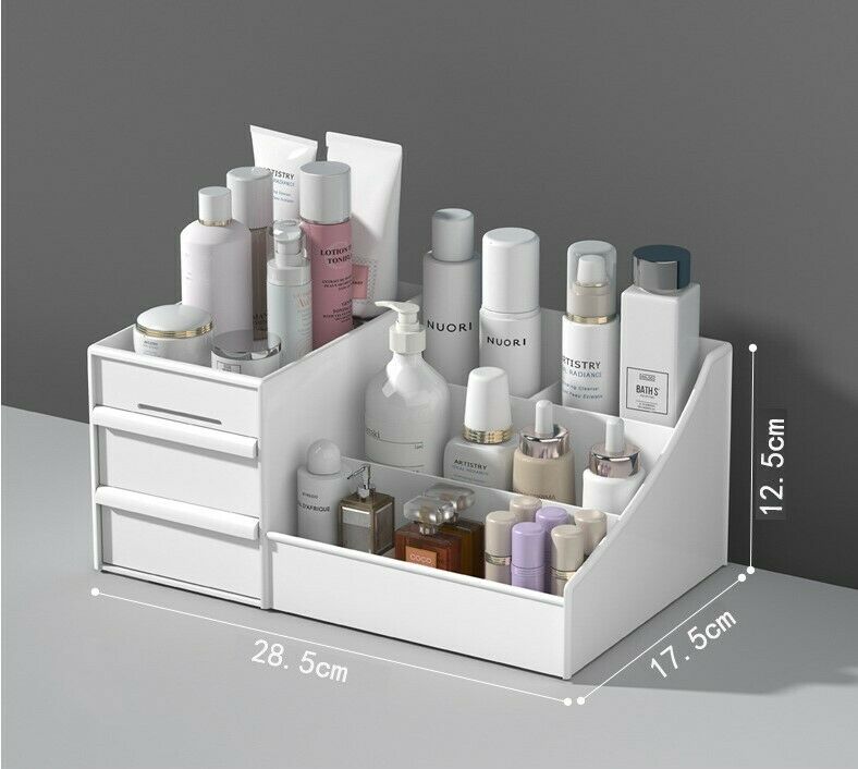 White Desk Cosmetic Organiser Lipstick Brush Holder Makeup Storage Case +2 Draws