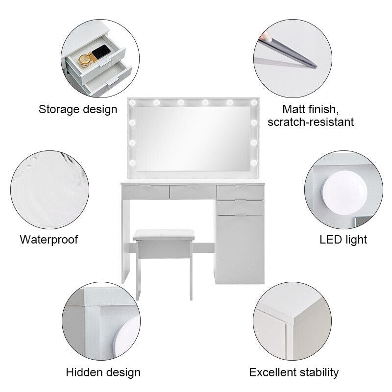 White Dressing Table Set with 4 Drawers LED Lights Mirror Bedroom Makeup Table