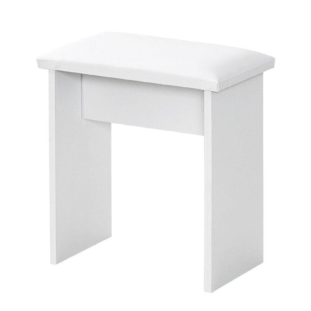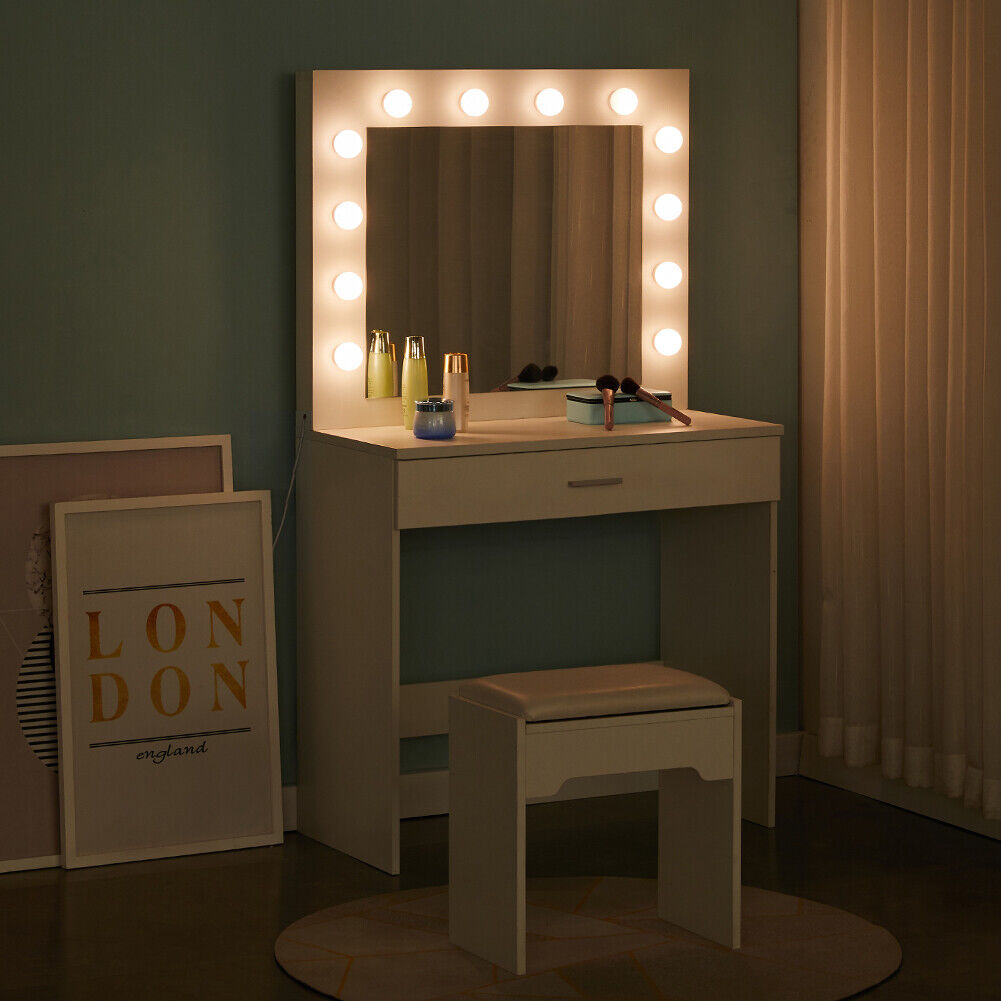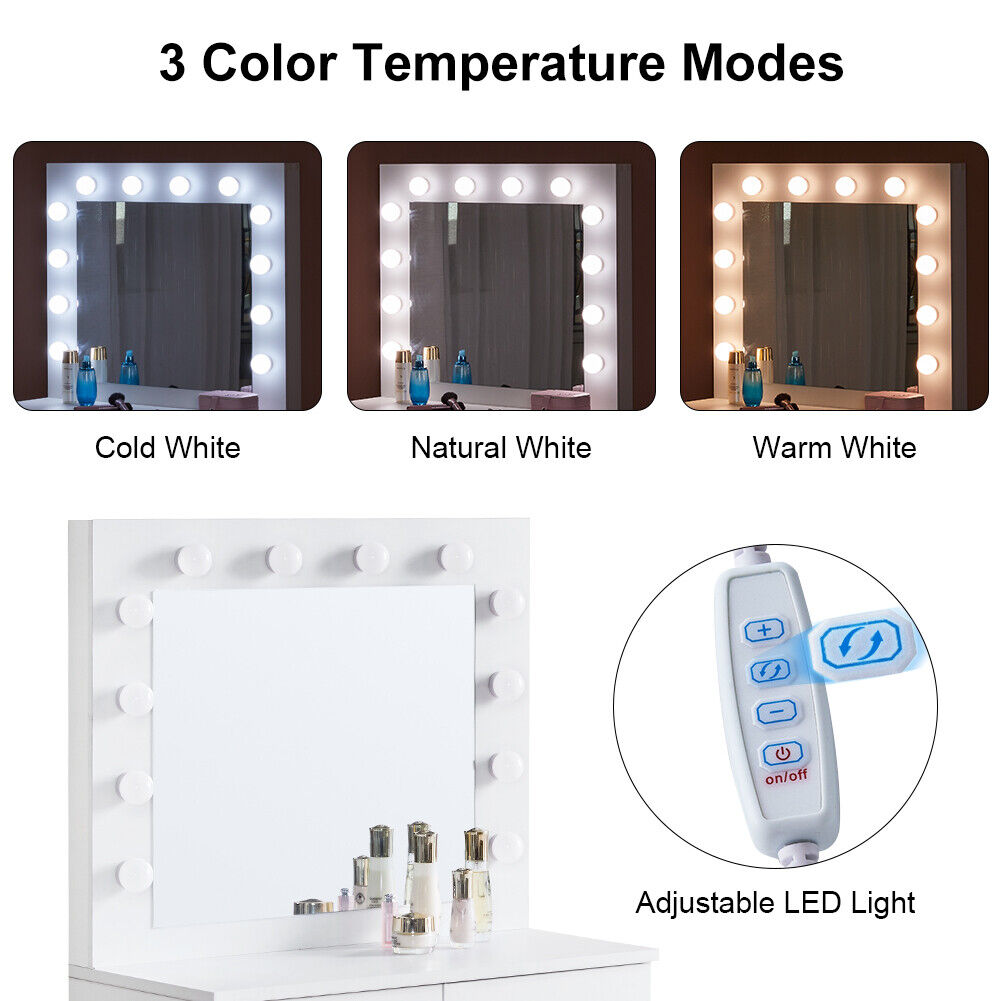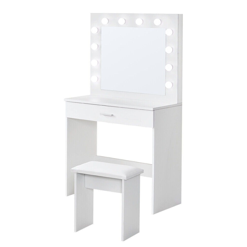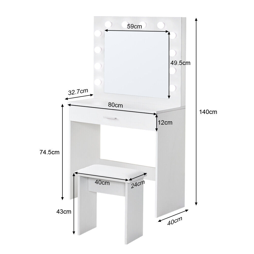 White Dressing Table w/ LED Bulb Lighting 2 Drawers Upholstered Stool Bedroom