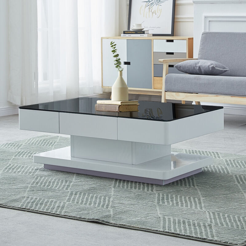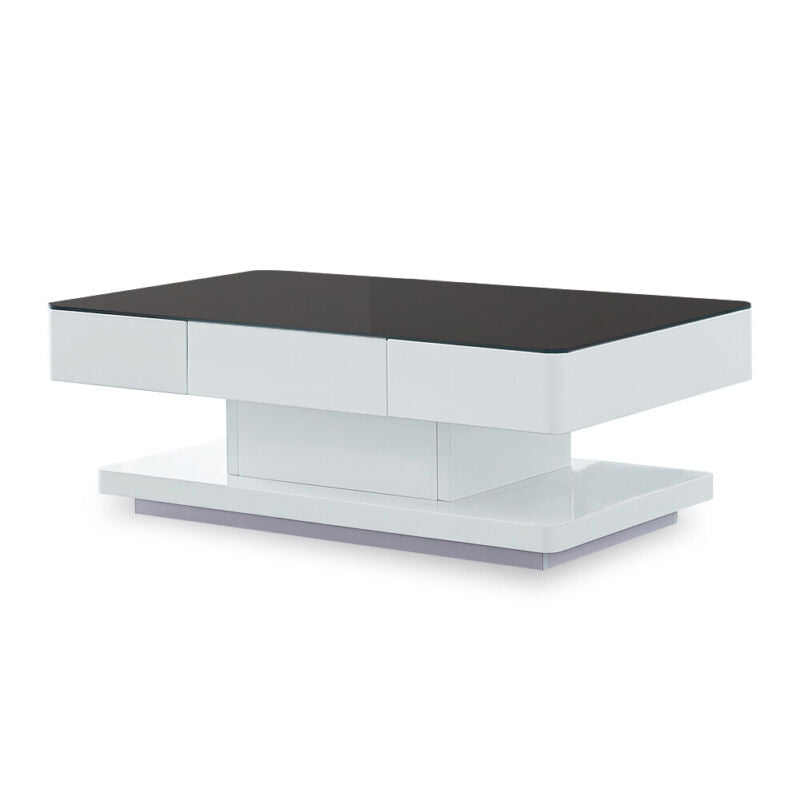 White High Gloss Coffee Table Black Glass Top Rectangular Living Room 2 Drawers