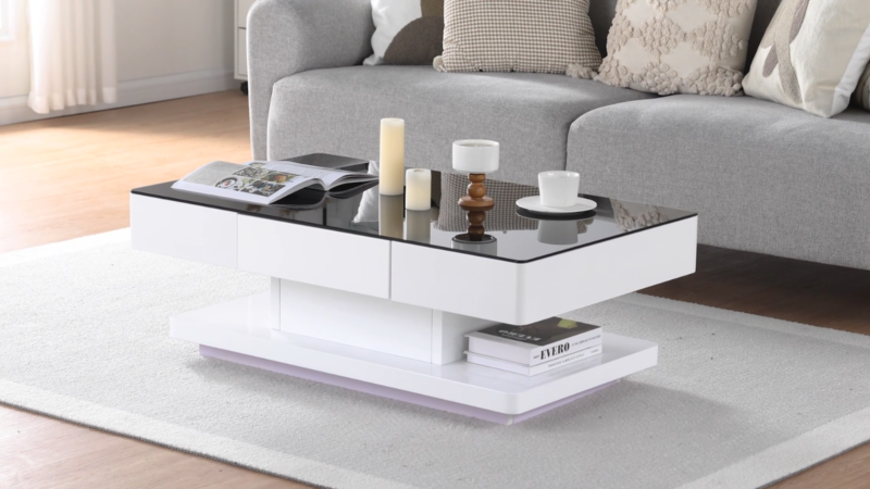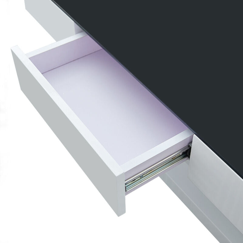 White High Gloss Coffee Table Black Glass Top Rectangular Living Room 2 Drawers