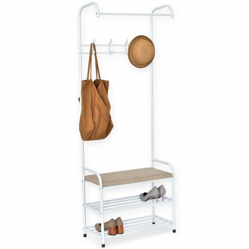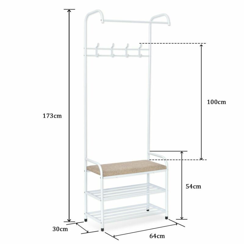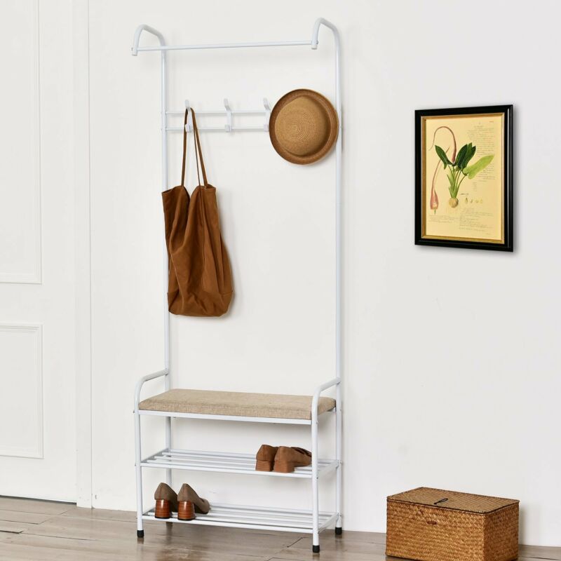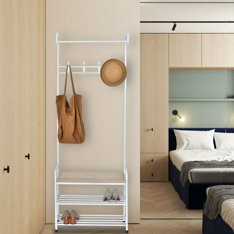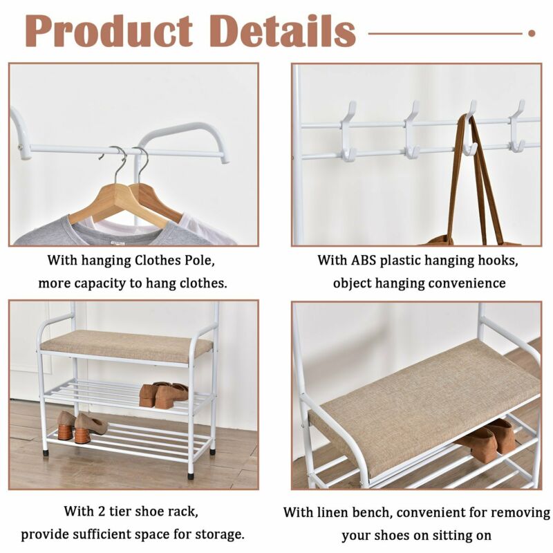 White Metal Clothes Hanging Rail Clothing Coat Stand with Shoe Rack Shelf Bench