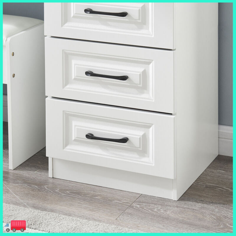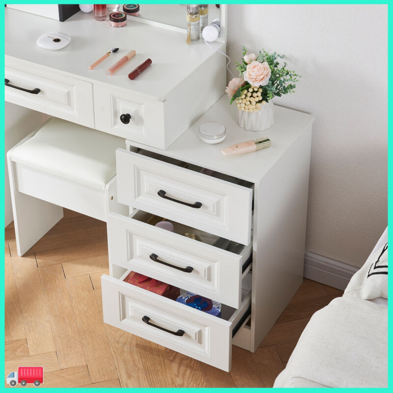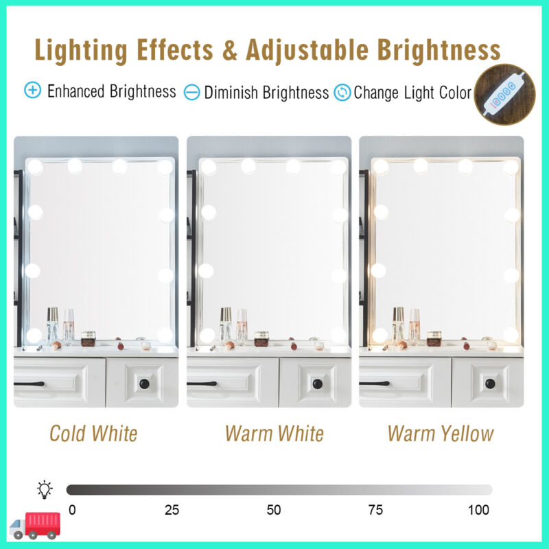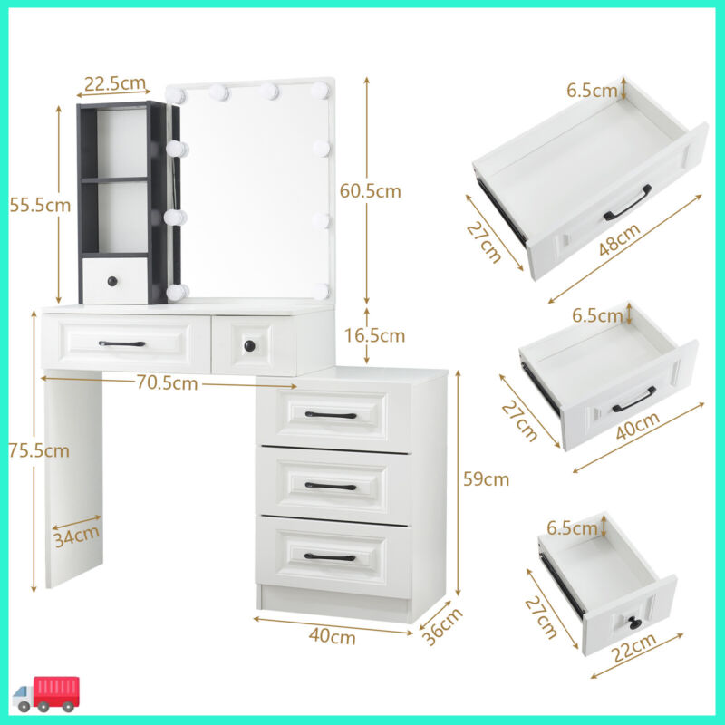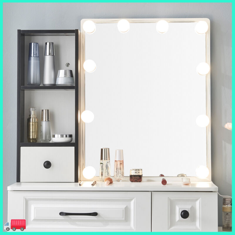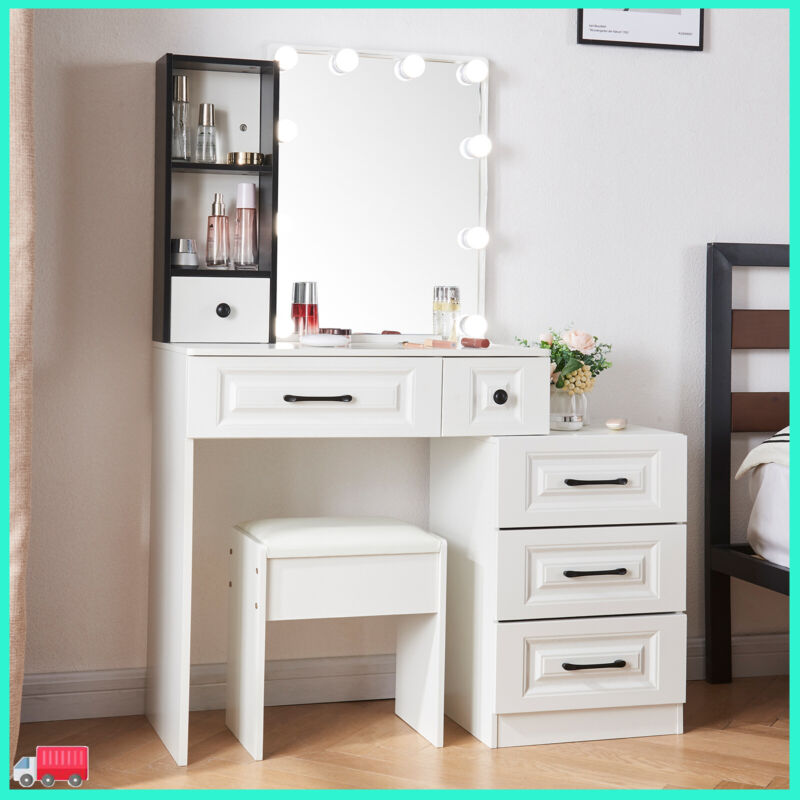 White Modern Dressing Table Mirror Vanity Makeup Desk Stool Set with LED Lights