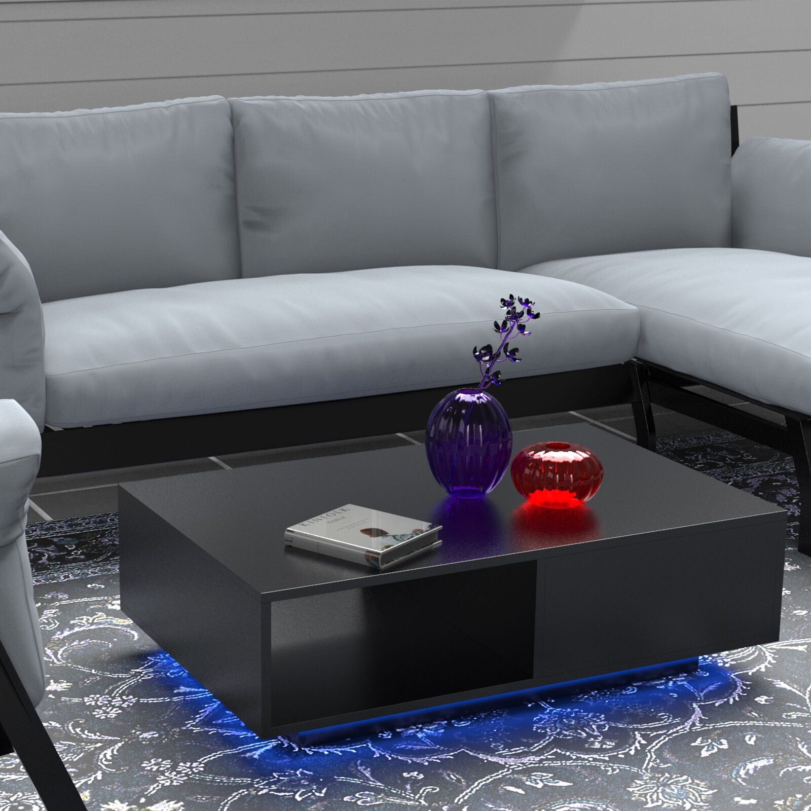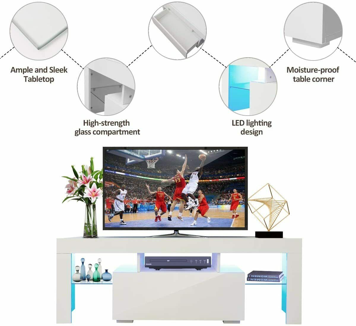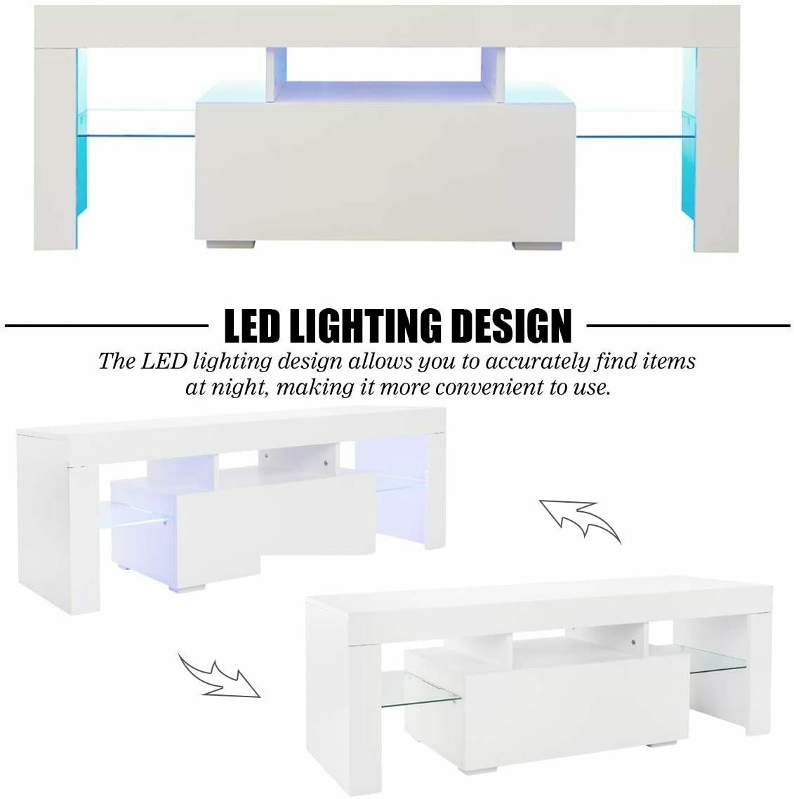 - Features: Contains LEDs, Adjustable Height, Flat Pack, High Gloss, With LED, With Shelves