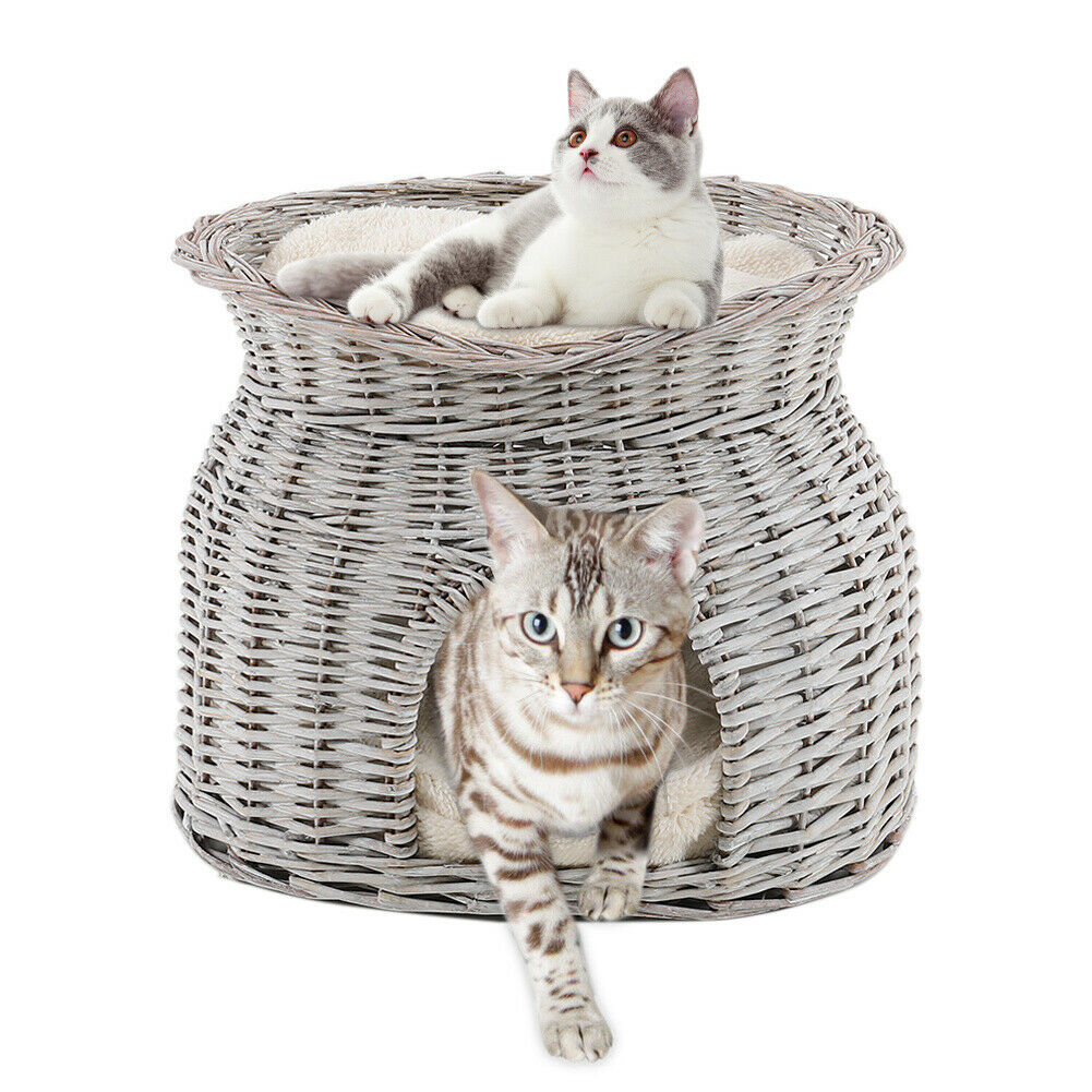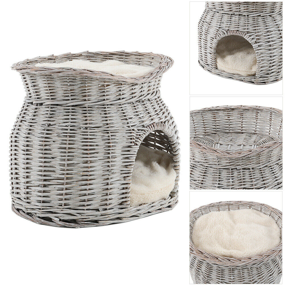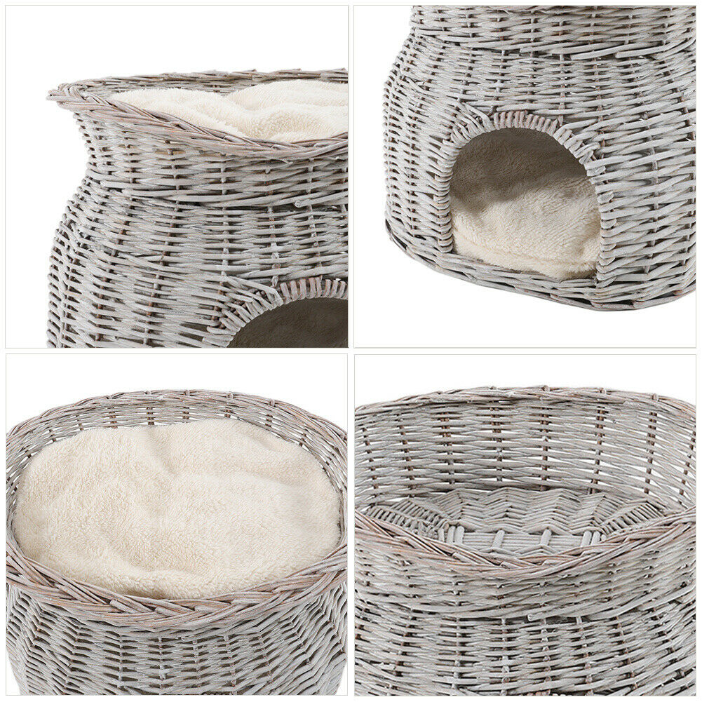 Wicker Handmade Willow 2Tier Bunk Basket Pet Cat Pup Bed House w/ 2 Soft Cushion